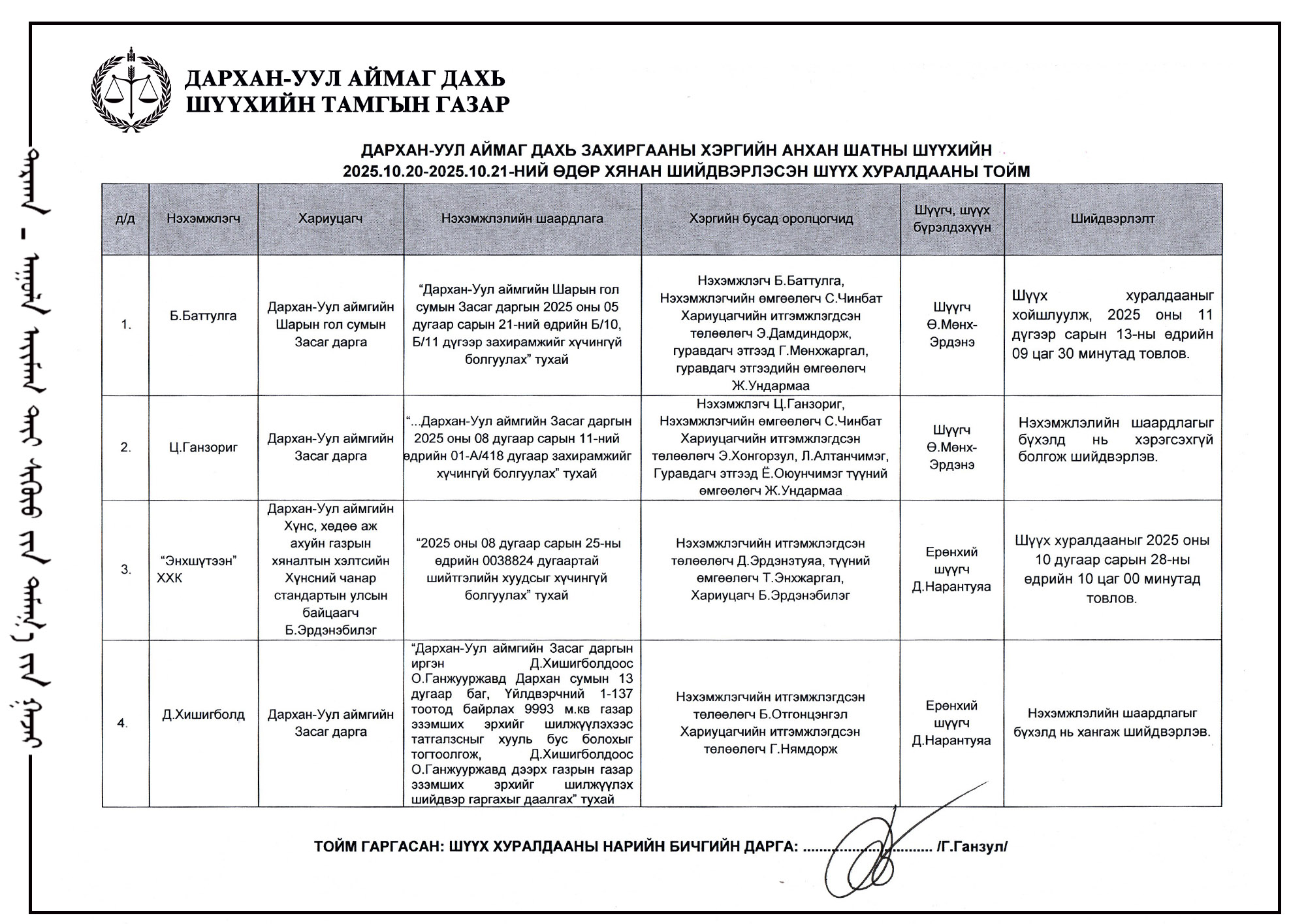 ШҮҮХ ХУРАЛДААНЫ ТОВ /Иргэний хэргийн анхан шатны шүүх 2025.10.20-10.24/