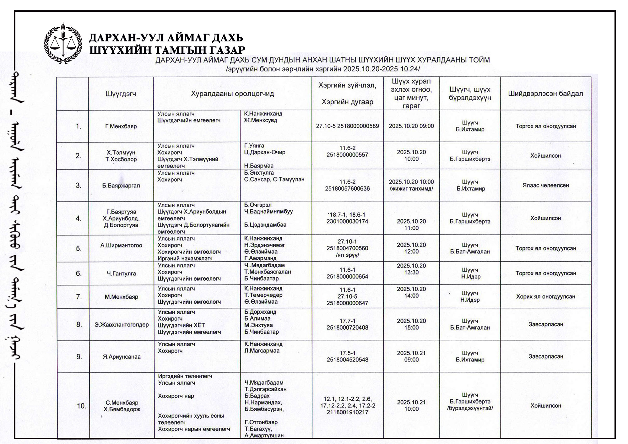 ШҮҮХ ХУРАЛДААНЫ ТОЙМ /Эрүүгийн хэргийн анхан шатны шүүх 2025.10.20-10.24/