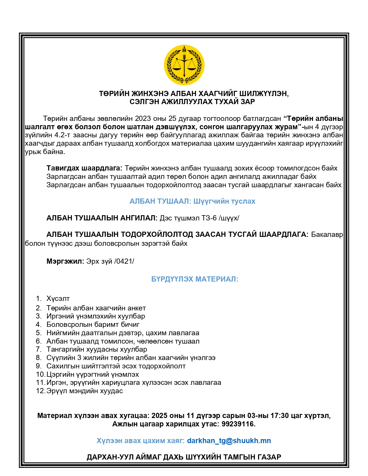 ТӨРИЙН ЖИНХЭНЭ АЛБАН ХААГЧИЙГ ШИЛЖҮҮЛЭН, СЭЛГЭН АЖИЛЛУУЛАХ ТУХАЙ ЗАР