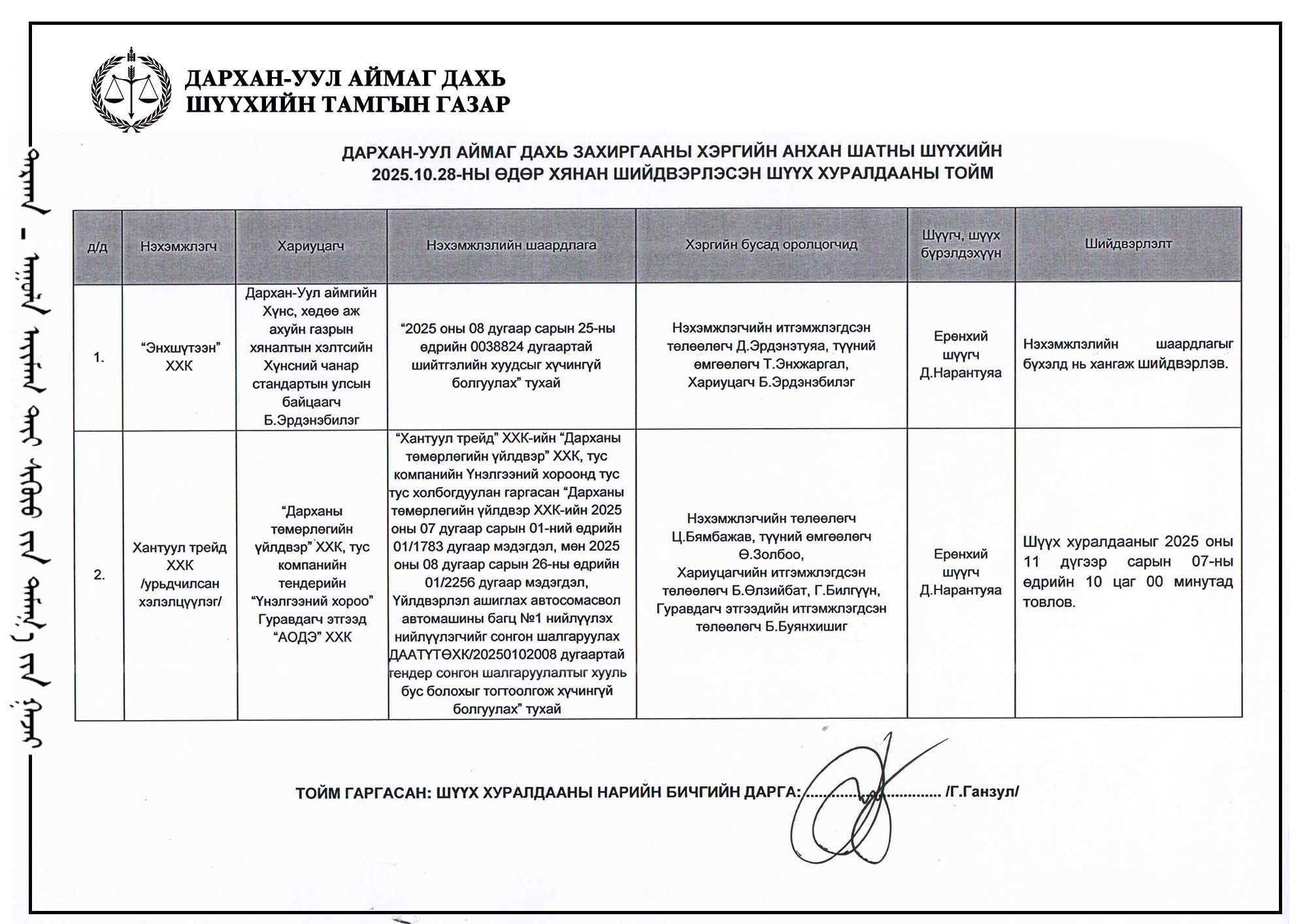 ШҮҮХ ХУРАЛДААНЫ ТОЙМ /Захиргааны хэргийн анхан шатны шүүх 2025.10.28/