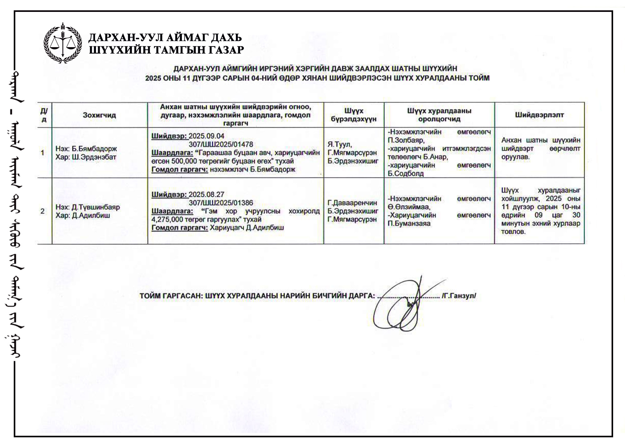 ШҮҮХ ХУРАЛДААНЫ ТОВ /Иргэний хэргийн анхан шатны шүүх 2025.11.03-11.07/