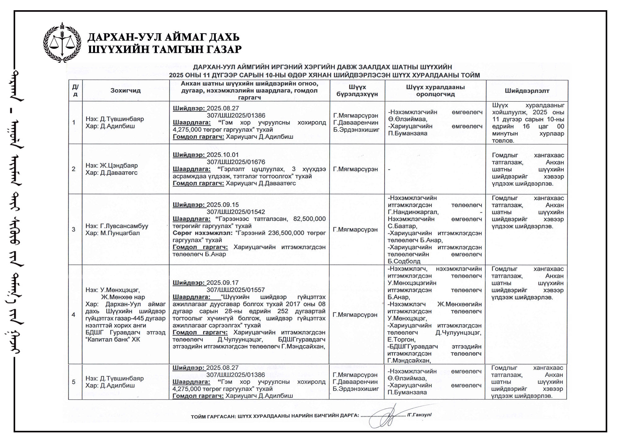 ШҮҮХ ХУРАЛДААНЫ ТОВ /ДАРХАН-УУЛ АЙМАГ ДАХЬ ЗАХИРГААНЫ ХЭРГИЙН АНХАН ШАТНЫ ШҮҮХ 2026.02.02-2026.02.06/