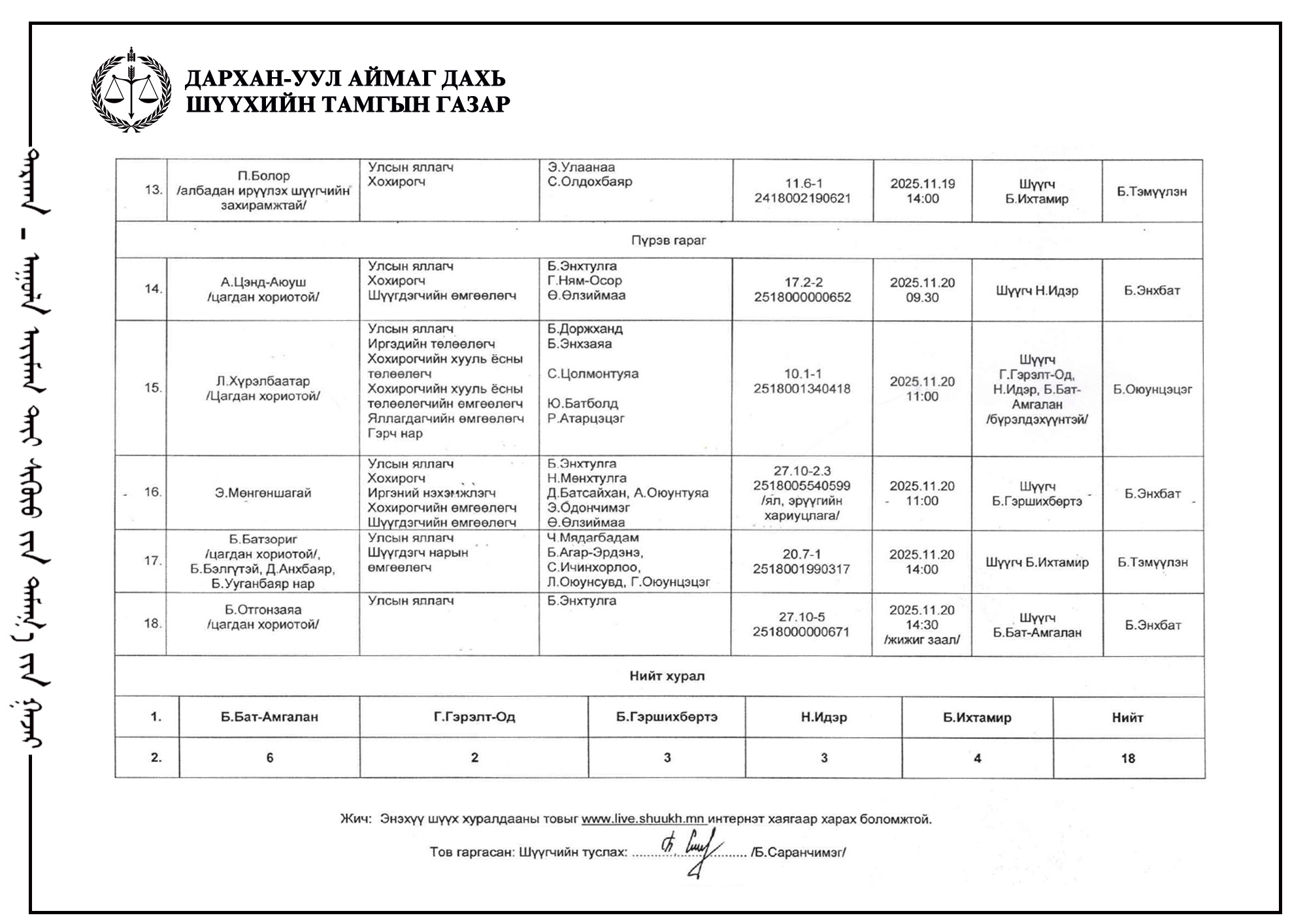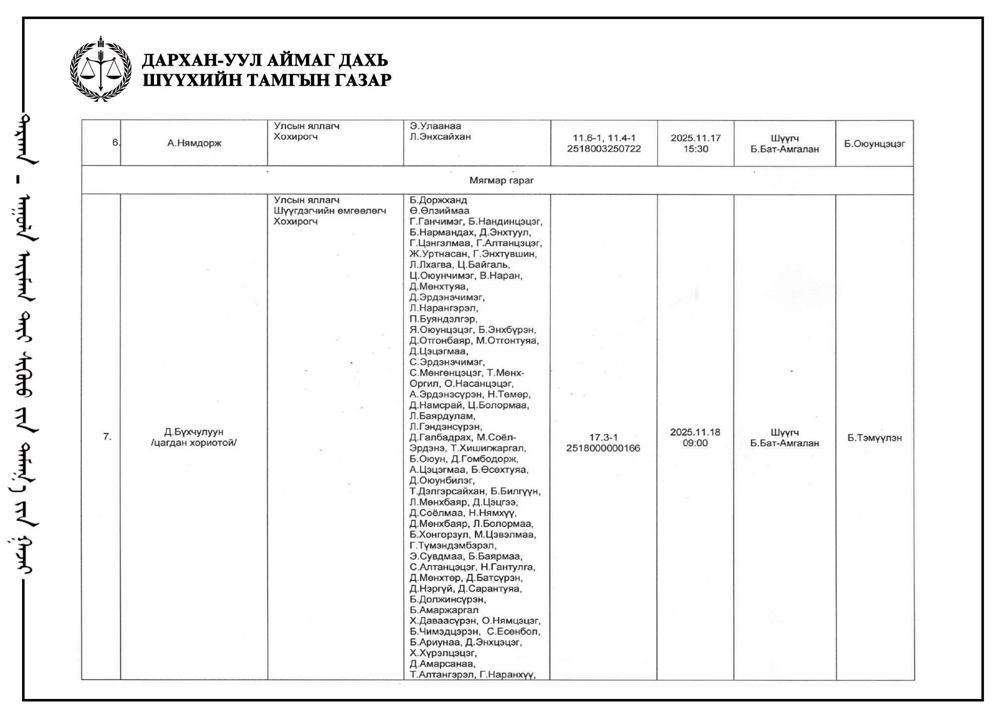 ШҮҮХ ХУРАЛДААНЫ ТОВ /Эрүүгийн хэргийн анхан шатны шүүх 2025.11.17-11.20/