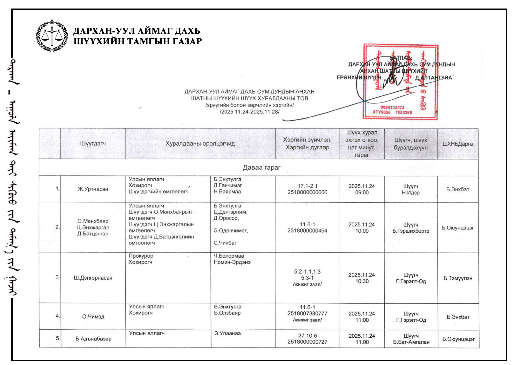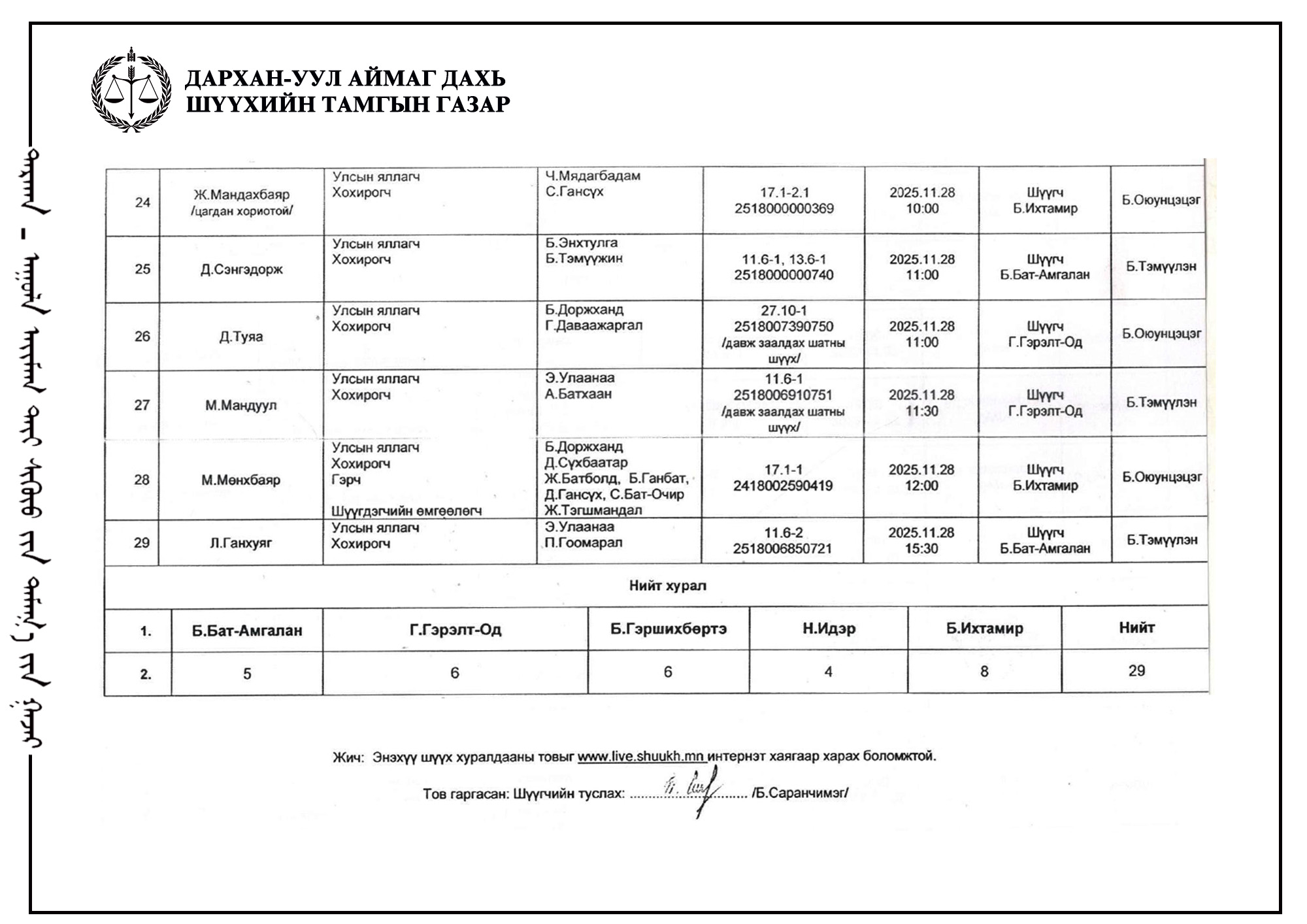 ШҮҮХ ХУРАЛДААНЫ ТОВ /Эрүүгийн хэргийн анхан шатны шүүх 2025.11.24-11.28/