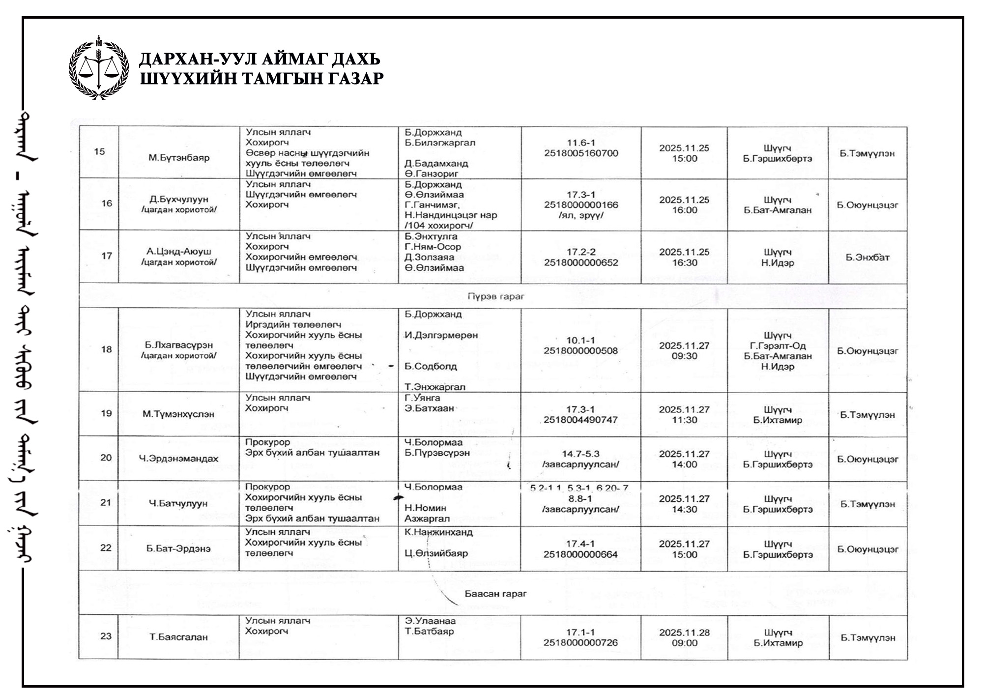 ШҮҮХ ХУРАЛДААНЫ ТОВ /Иргэний хэргийн анхан шатны шүүх 2025.11.17-11.20/