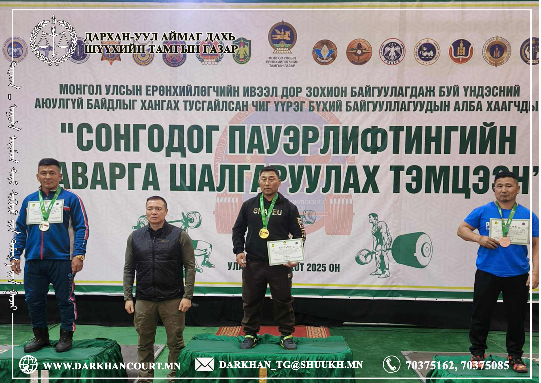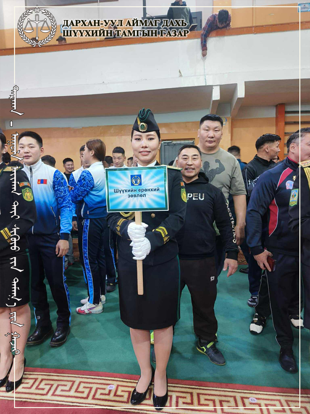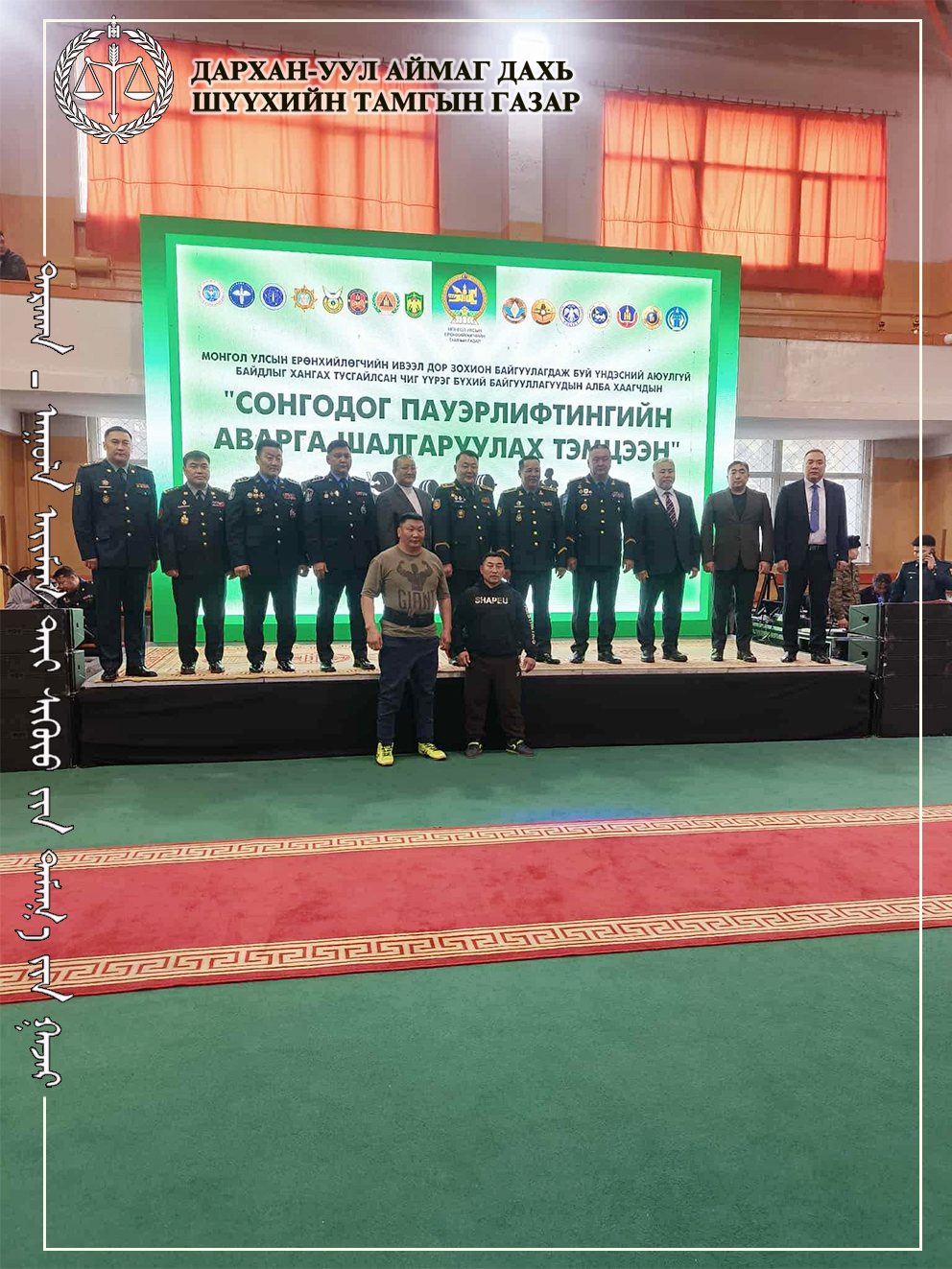 Тус тэмцээнд хууль сахиулах чиг үүрэг бүхий 15 байгууллагын 190 гаруй тамирчид оролцож Штангтай суулт, Хэвтээ шахалт, Штангтай таталт гэсэн гурван төрөлд авхаалж самбаагаа сорьж Дархан-Уул аймаг дахь шүүхийн Тамгын газрын тамирчин Бичиг хүргэгч, Дархан-Уул аймгийн заан Д.Энхтүвшин 120 кг жинд Суултын төрөлд, Таталтын төрөлд тус тус Хүрэл медаль,