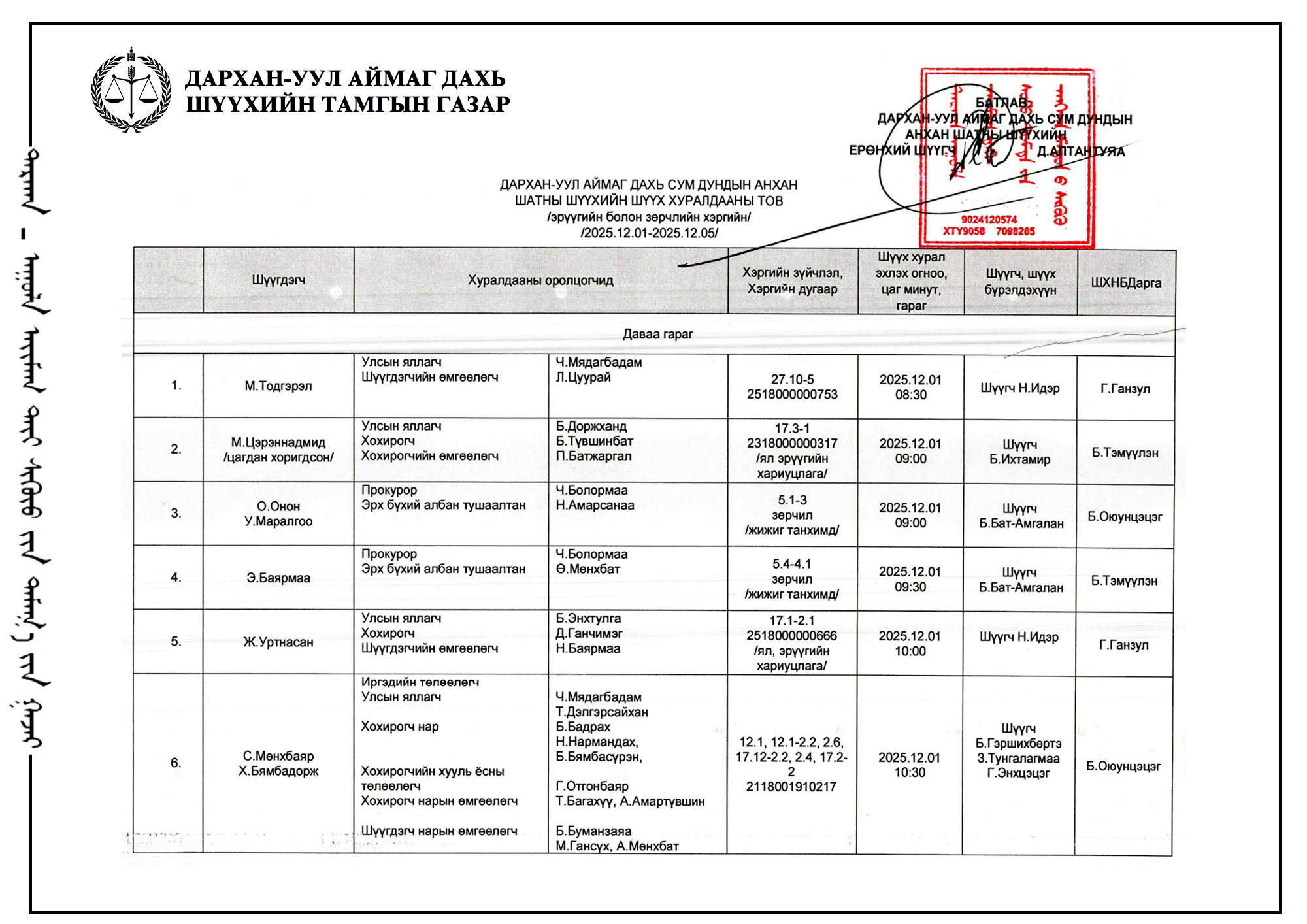ШҮҮХ ХУРАЛДААНЫ ТОВ /Эрүүгийн хэргийн анхан шатны шүүх 2025.12.01-12.05/