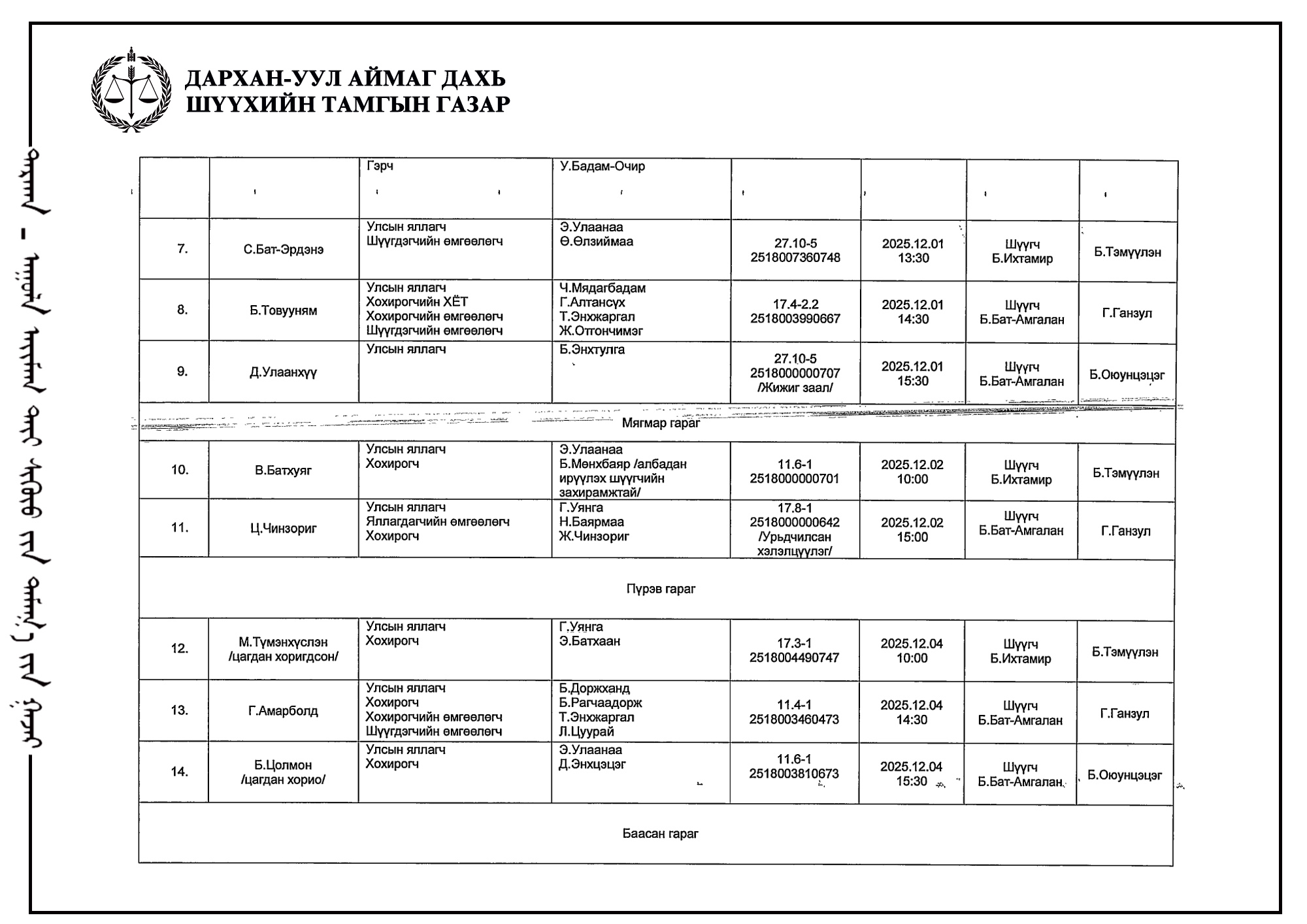 ШҮҮХ ХУРАЛДААНЫ ТОВ /Иргэний хэргийн анхан шатны шүүх 2025.12.01-12.05/