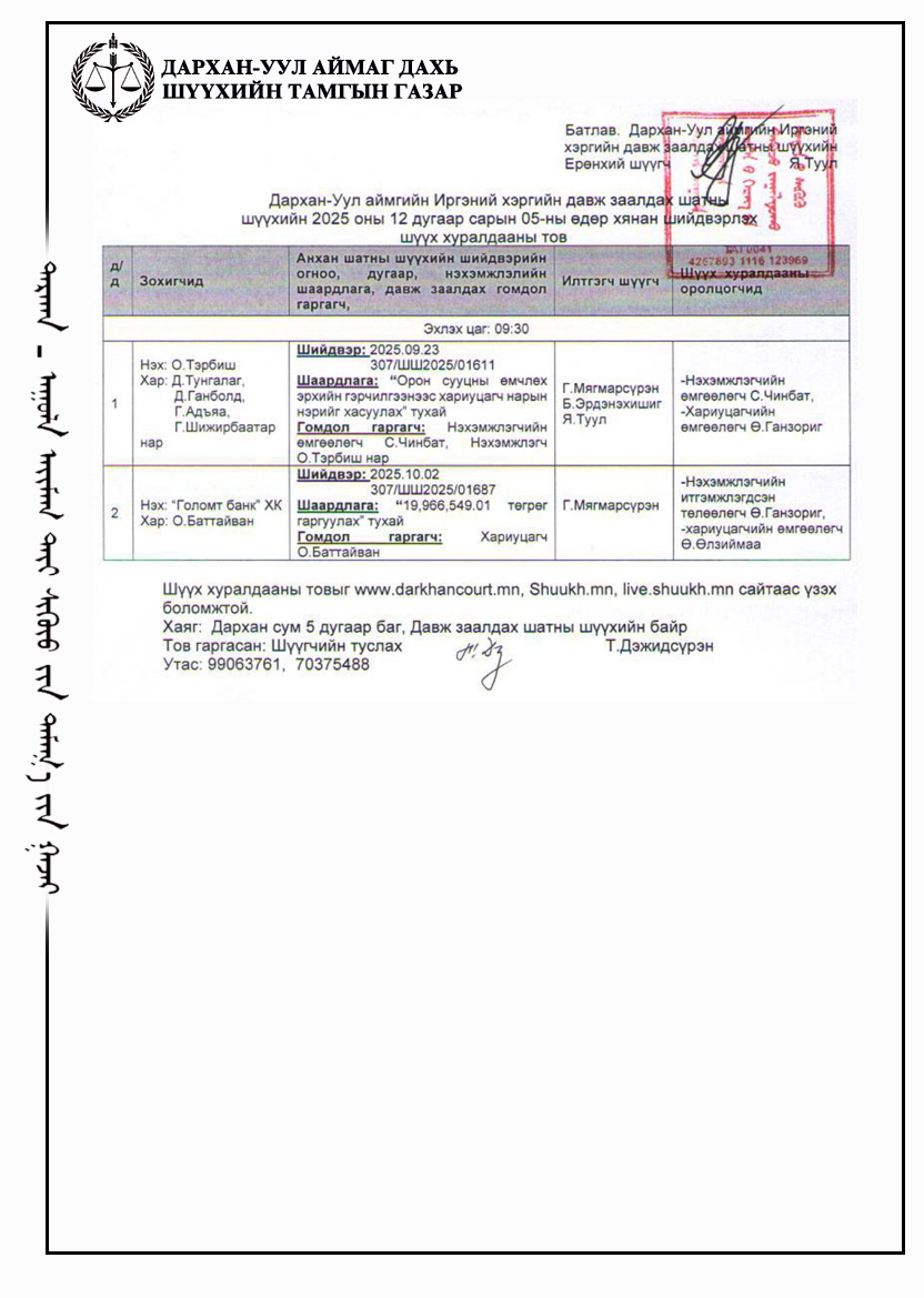 ШҮҮХ ХУРАЛДААНЫ ТОВ /Иргэний хэргийн анхан шатны шүүх 2025.12.01-12.05/
