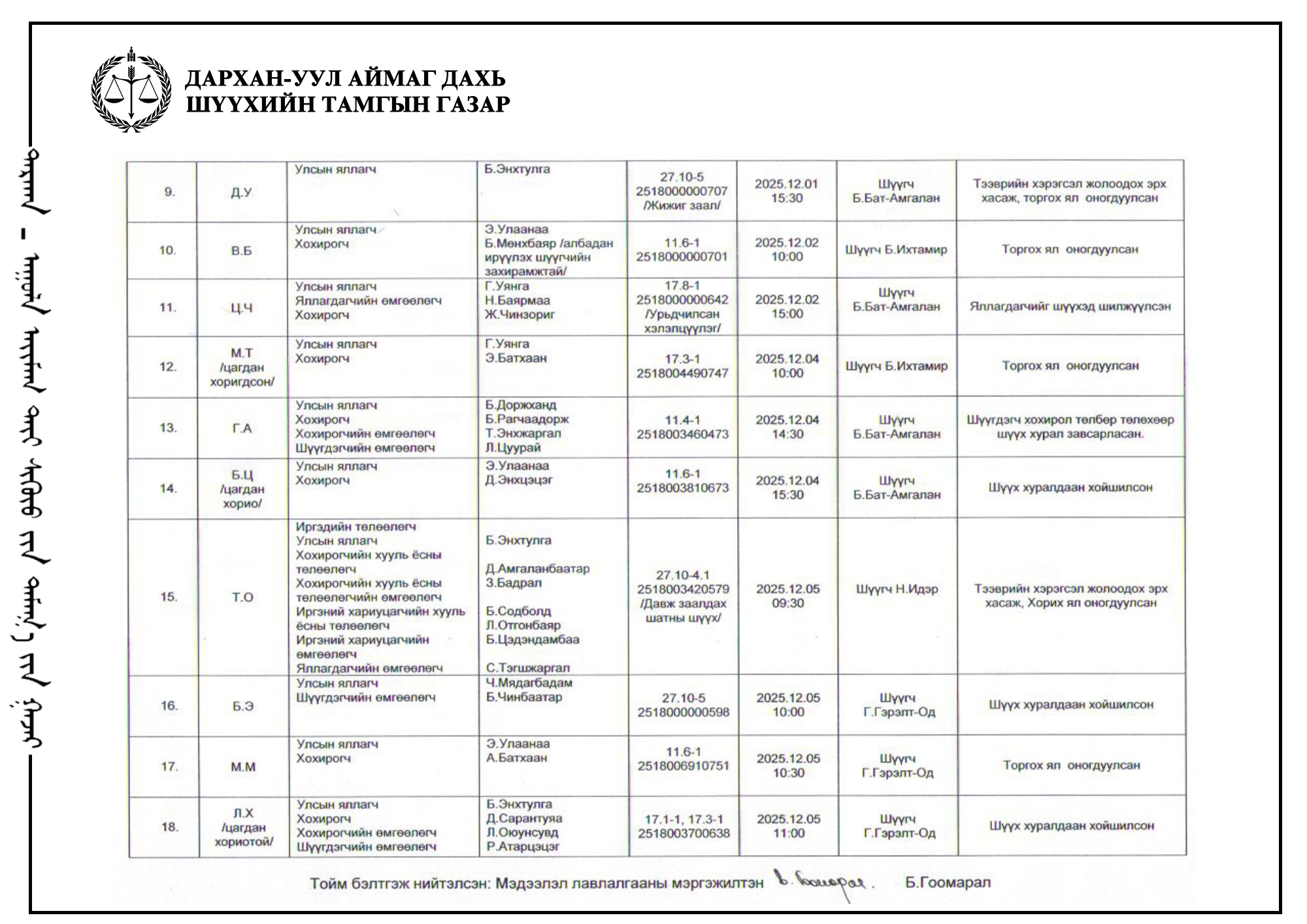 ШҮҮХ ХУРАЛДААНЫ ТОЙМ /Эрүүгийн хэргийн анхан шатны шүүх 2025.12.01-12.05/