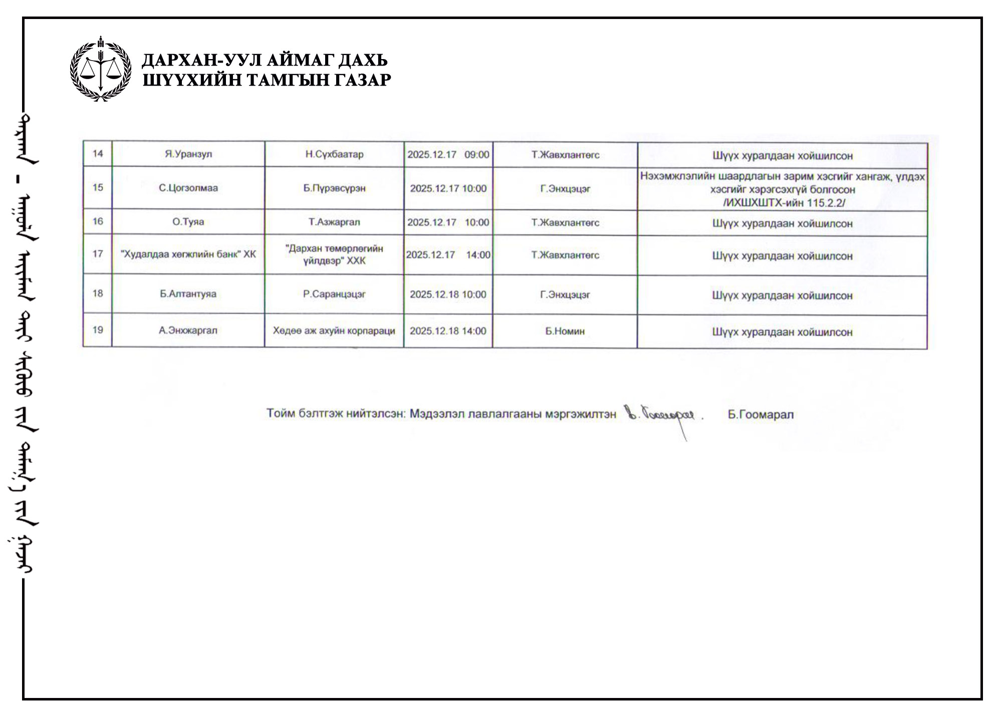 ШҮҮХ ХУРАЛДААНЫ ТОЙМ /Эрүүгийн хэргийн анхан шатны шүүх 2025.12.15-12.19/