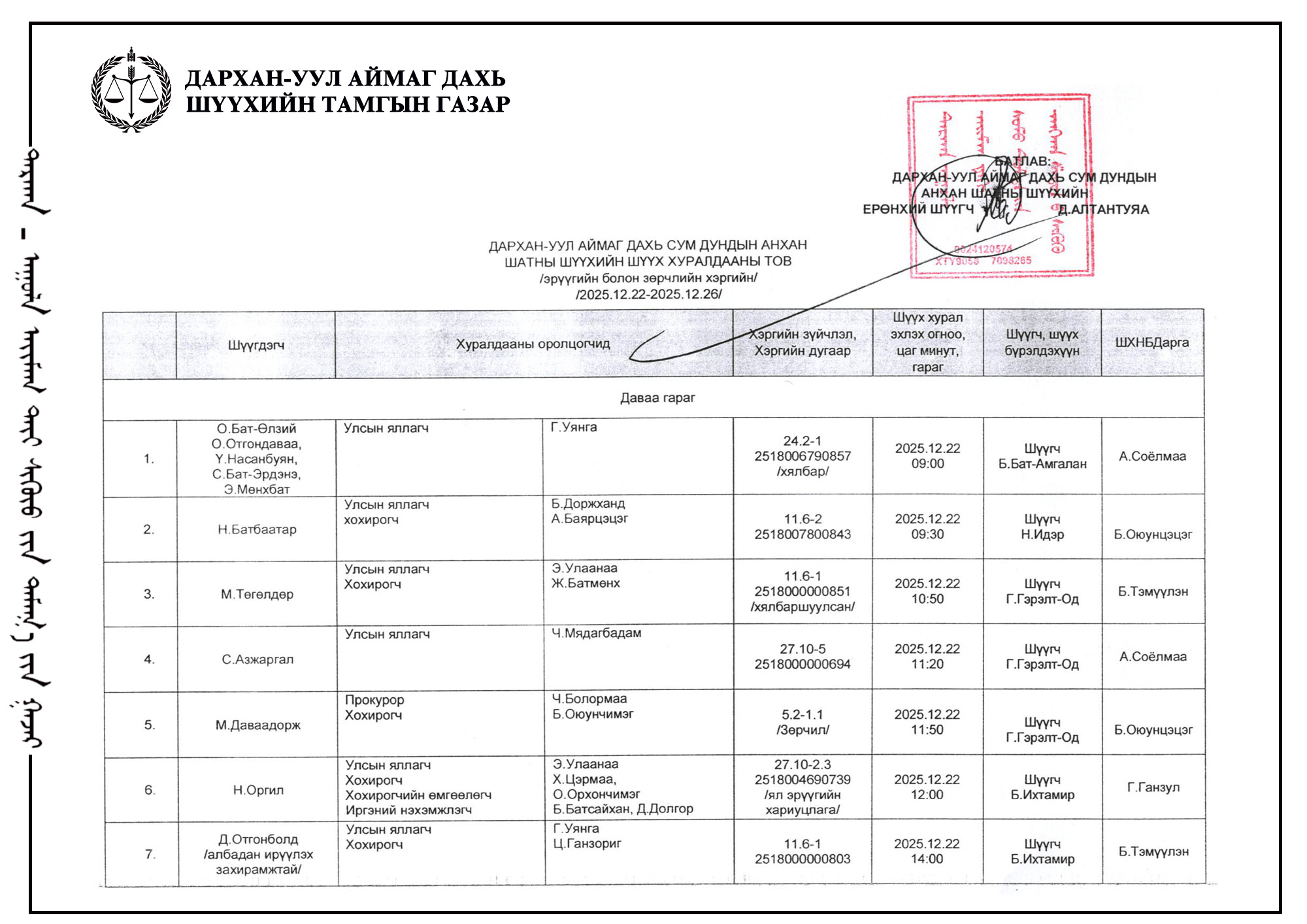ШҮҮХ ХУРАЛДААНЫ ТОВ /Эрүүгийн хэргийн анхан шатны шүүх 2025.12.22-12.26/