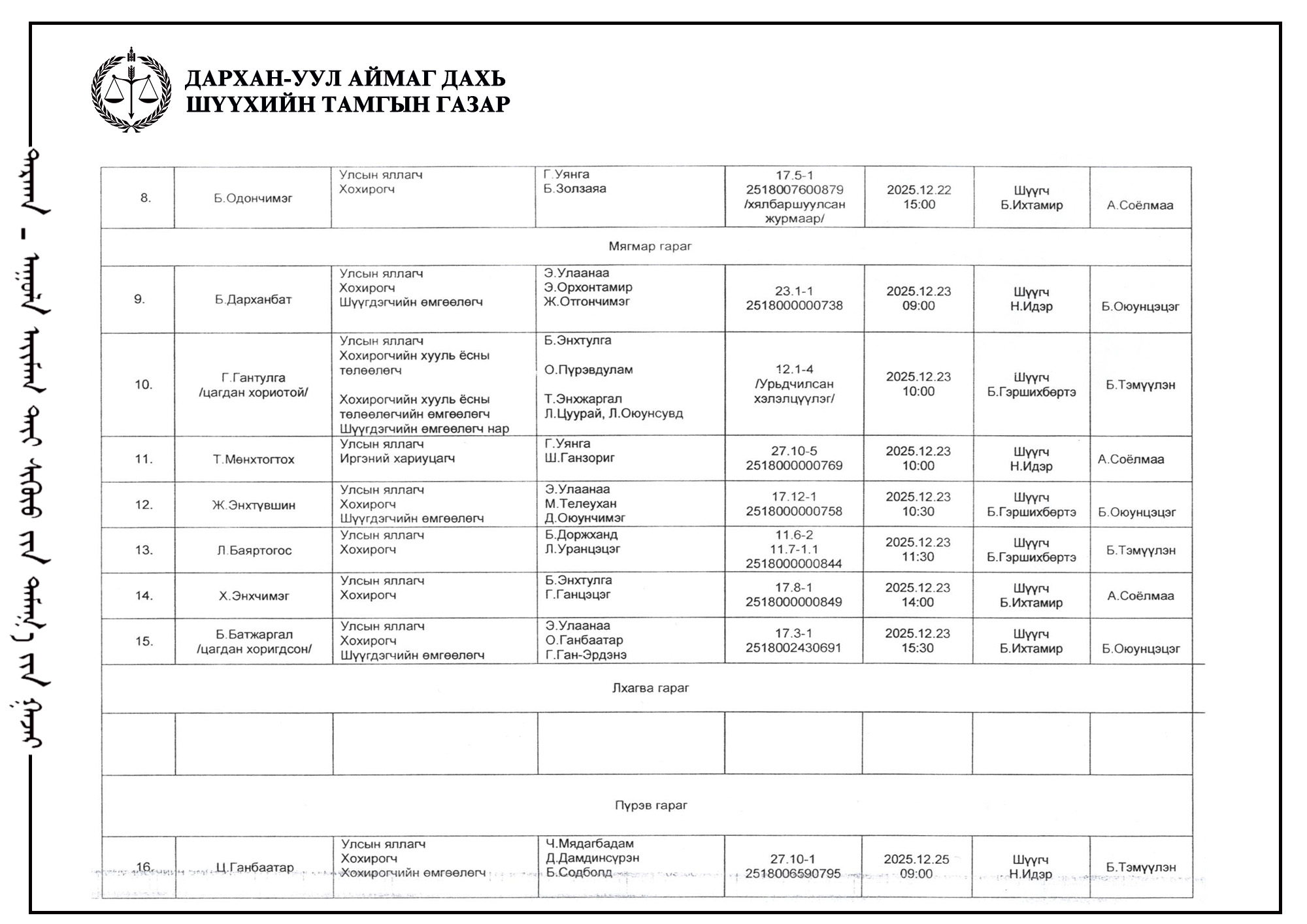 ЭРҮҮГИЙН БОЛОН ЗӨРЧЛИЙН ХЭРГИЙН ШҮҮХ ХУРАЛДААНЫ ТОВ /ДАРХАН-УУЛ АЙМАГ ДАХЬ СУМ ДУНДЫН АНХАН ШАТНЫ ШҮҮХ 2026.02.02-2026.02.06/