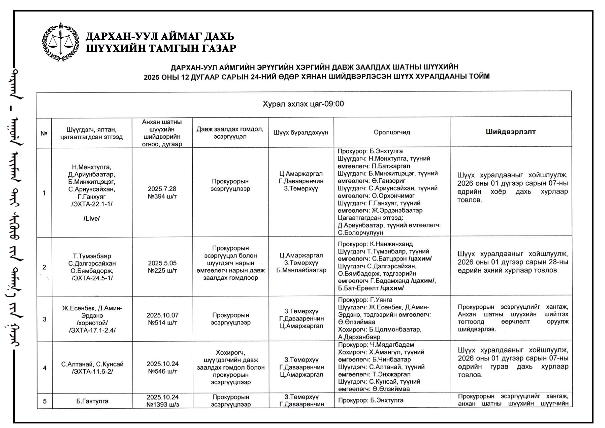 ШҮҮХ ХУРАЛДААНЫ ТОЙМ /Эрүүгийн хэргийн анхан шатны шүүх 2025.12.15-12.19/