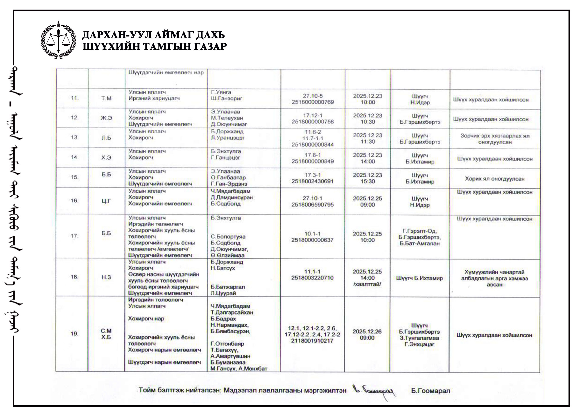 ШҮҮХ ХУРАЛДААНЫ ТОЙМ /Эрүүгийн хэргийн анхан шатны шүүх 2025.12.22-12.26/