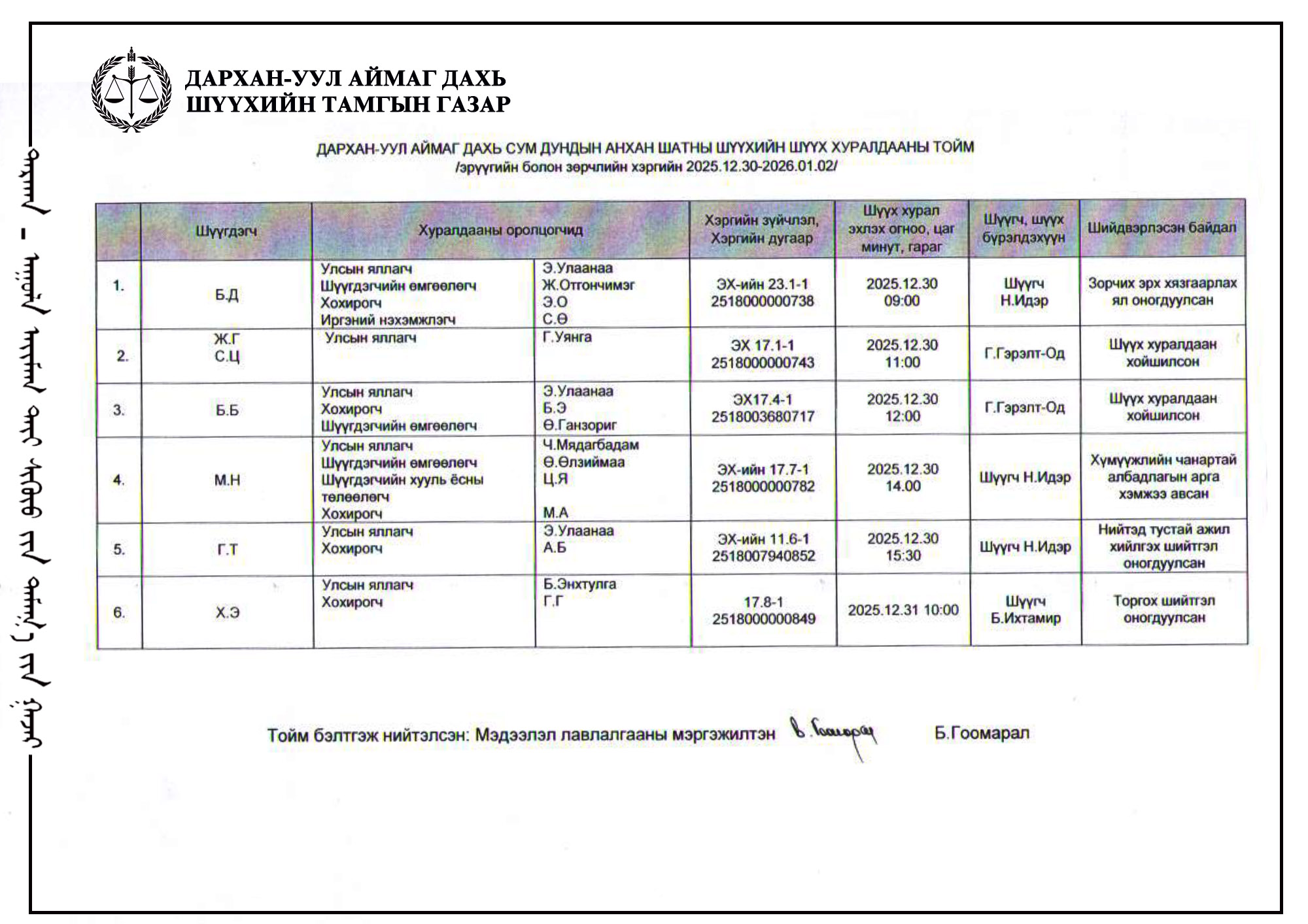 ШҮҮХ ХУРАЛДААНЫ ТОЙМ /Эрүүгийн хэргийн анхан шатны шүүх 2025.12.30-2025,01.02/