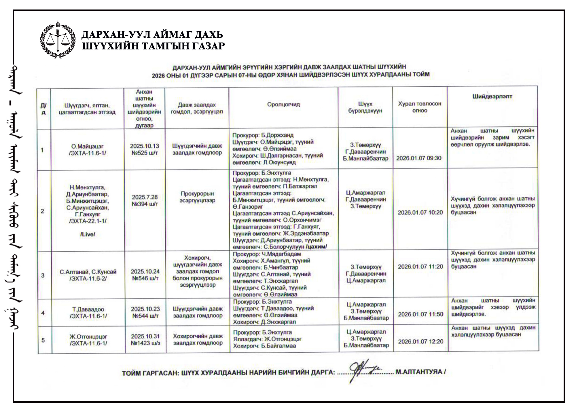 ШҮҮХ ХУРАЛДААНЫ ТОЙМ /Эрүүгийн хэргийн анхан шатны шүүх 2026.01.05-01.09/
