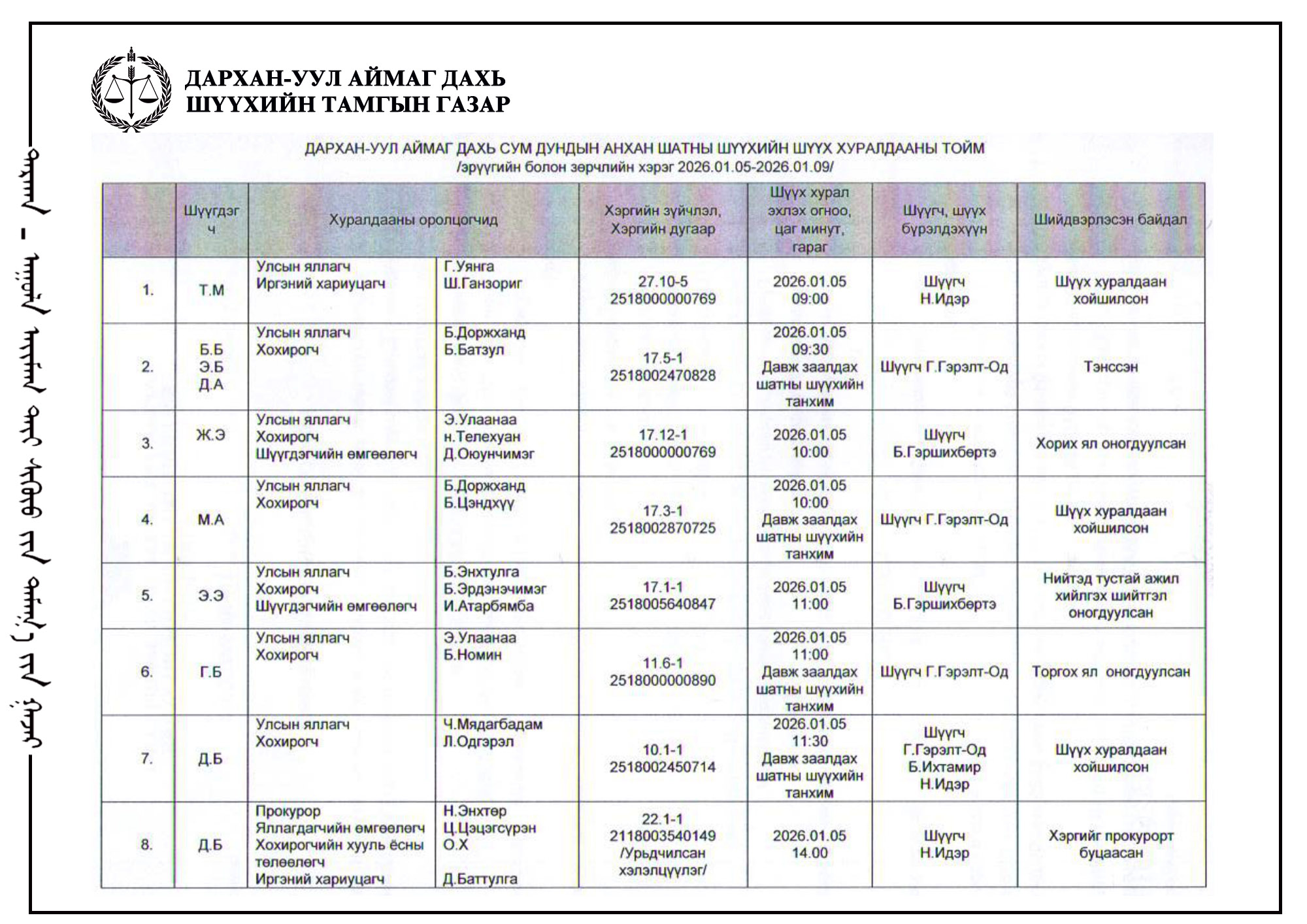 ШҮҮХ ХУРАЛДААНЫ ТОЙМ /Эрүүгийн хэргийн анхан шатны шүүх 2026.01.05-01.09/