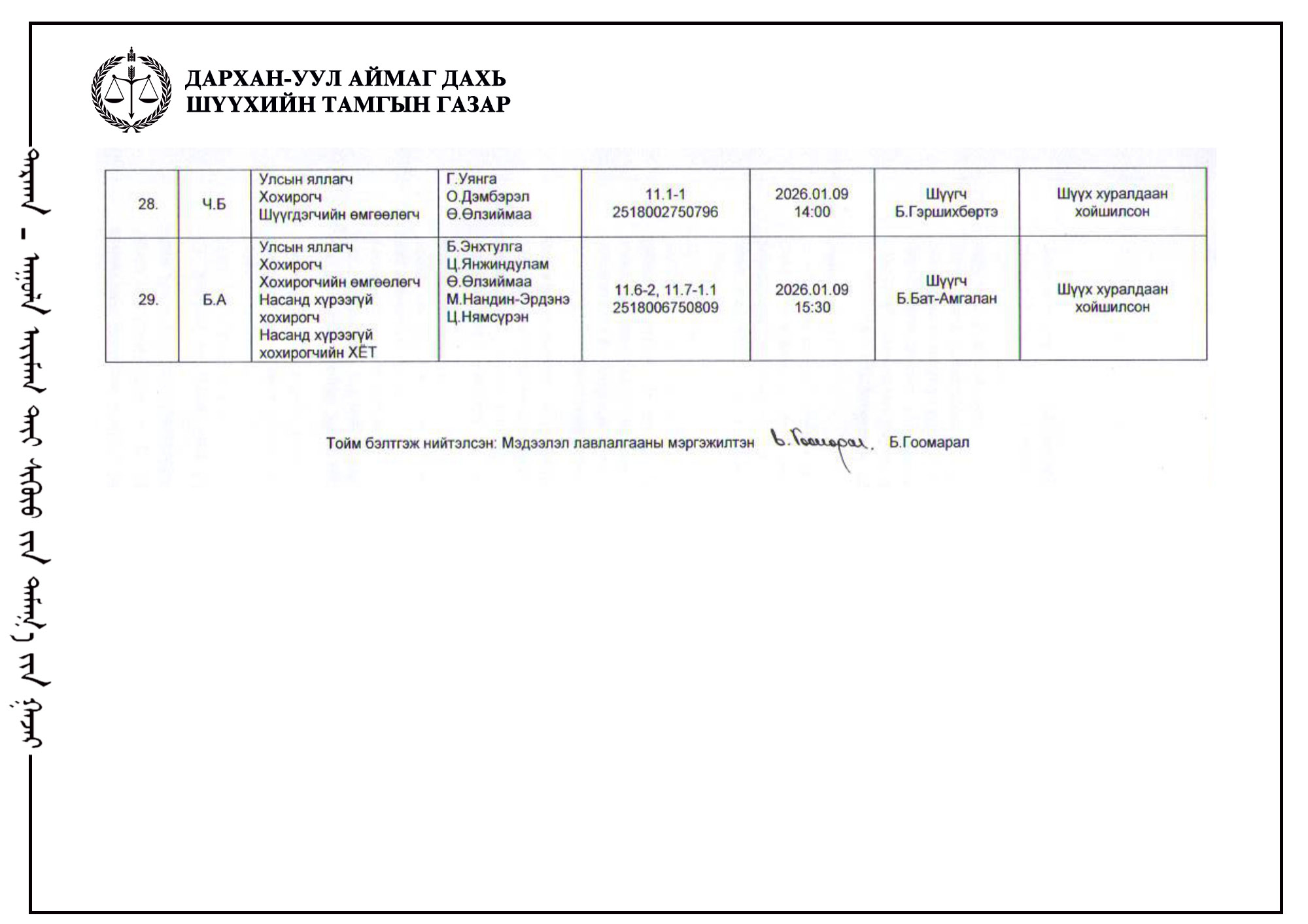 ШҮҮХ ХУРАЛДААНЫ ТОЙМ /Захиргааны хэргийн анхан шатны шүүх 2026.01.05/