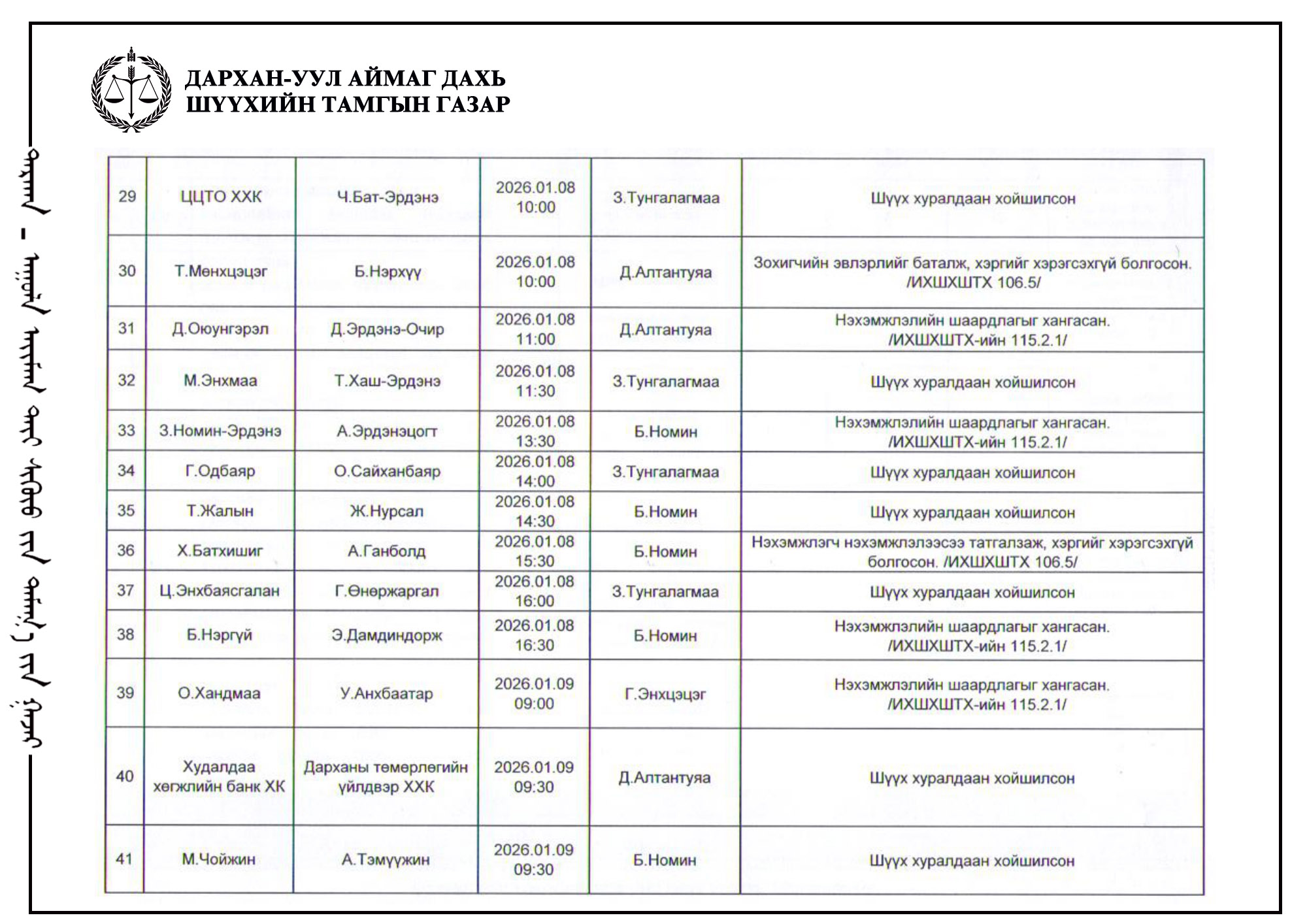 ШҮҮХ ХУРАЛДААНЫ ТОВ /Иргэний хэргийн анхан шатны шүүх 2026.01.12-01.16/