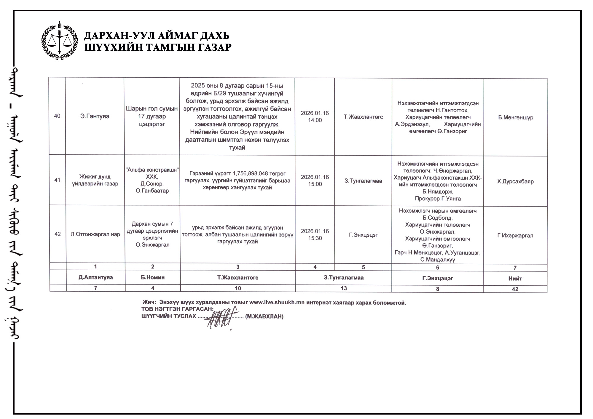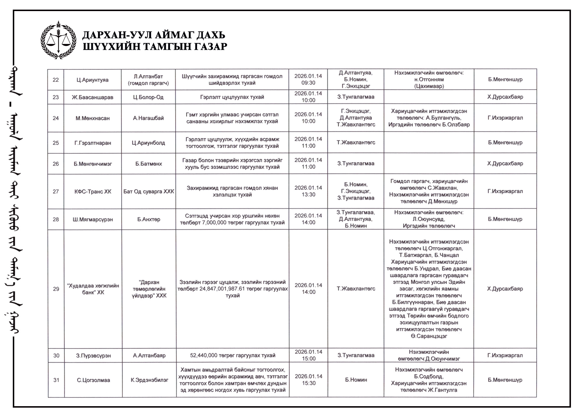 ШҮҮХ ХУРАЛДААНЫ ТОВ /Иргэний хэргийн анхан шатны шүүх 2026.01.12-01.16/