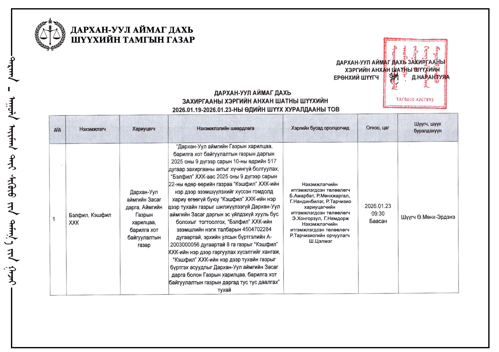 ШҮҮХ ХУРАЛДААНЫ ТОВ /ДАРХАН-УУЛ АЙМАГ ДАХЬ ЗАХИРГААНЫ ХЭРГИЙН АНХАН ШАТНЫ ШҮҮХ 2026.01.19-01.23/