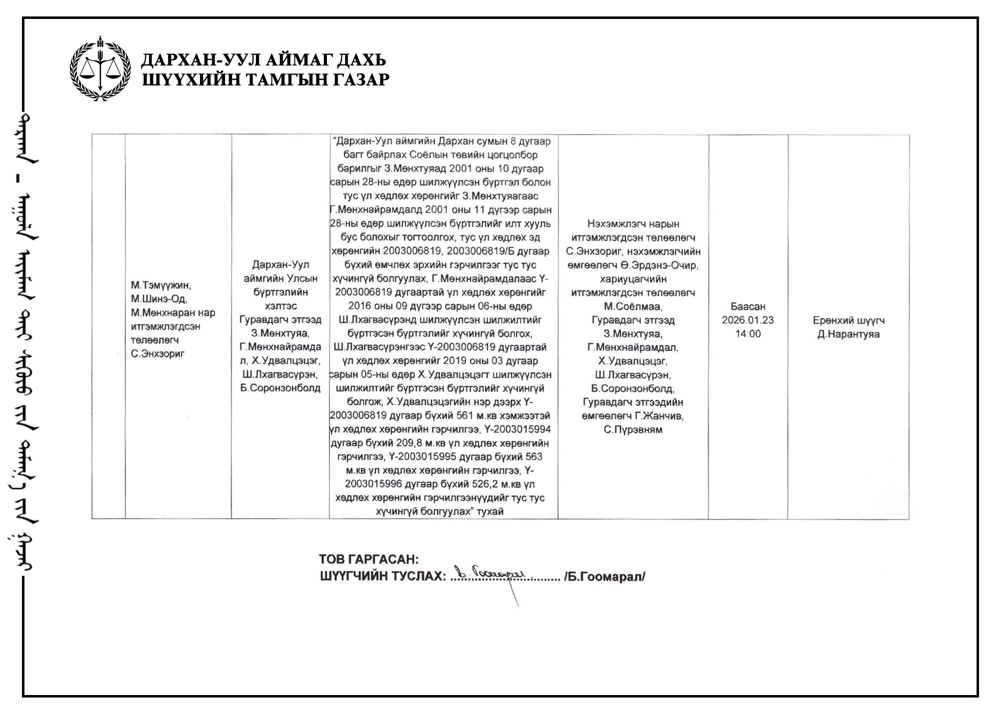 ШҮҮХ ХУРАЛДААНЫ ТОВ /ДАРХАН-УУЛ АЙМАГ ДАХЬ ЗАХИРГААНЫ ХЭРГИЙН АНХАН ШАТНЫ ШҮҮХ 2026.01.12-01.16/