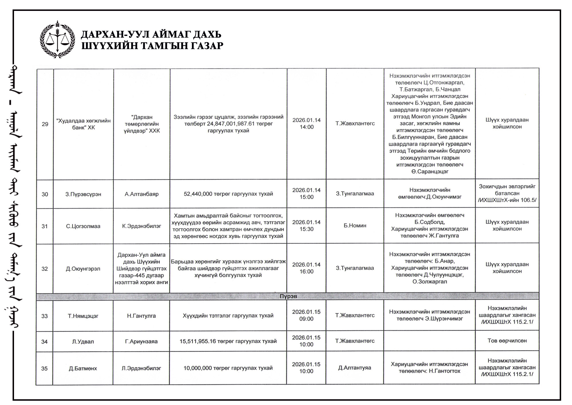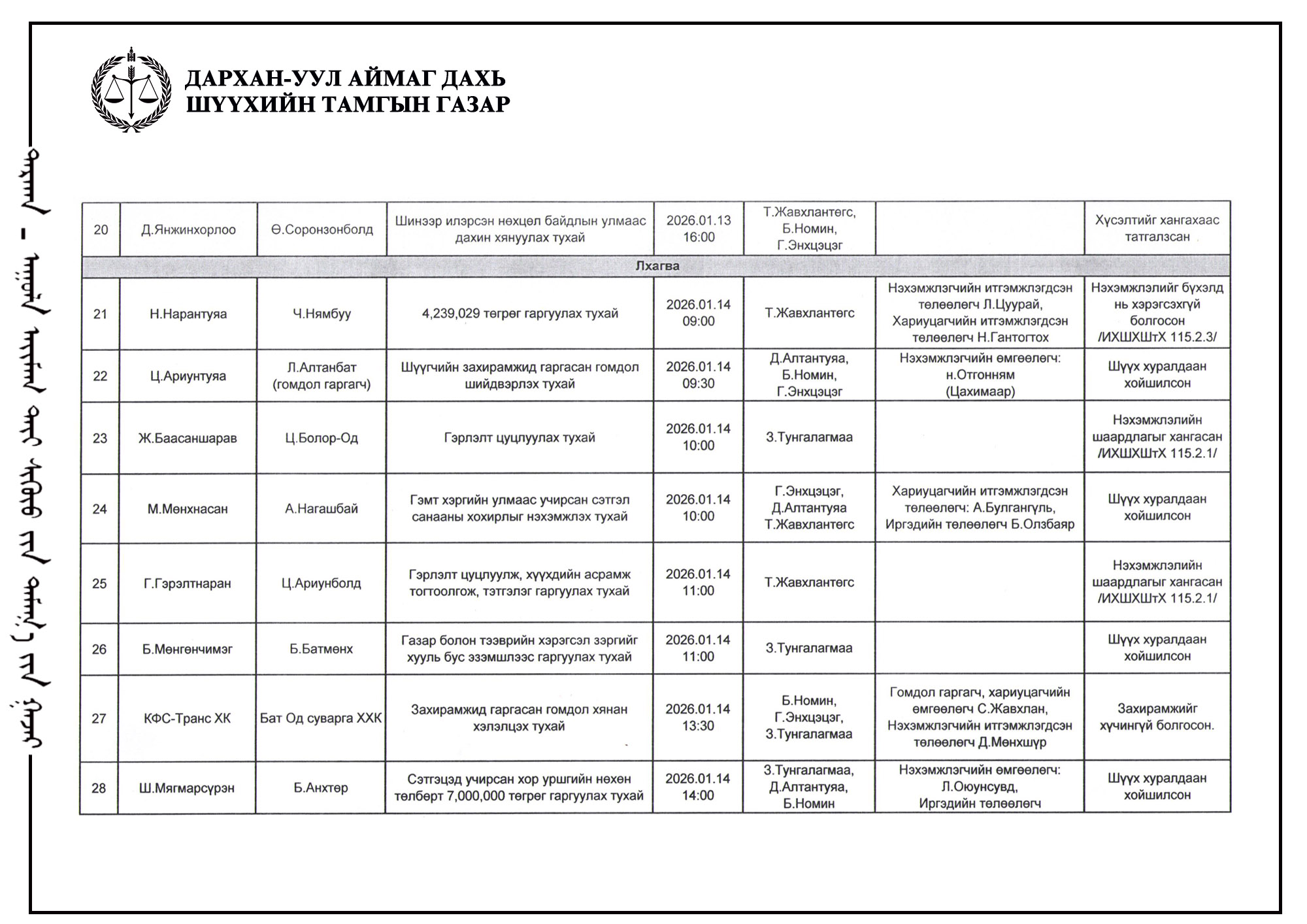 ШҮҮХ ХУРАЛДААНЫ ТОВ /Захиргааны хэргийн анхан шатны шүүх 2026.01.12-01.16/