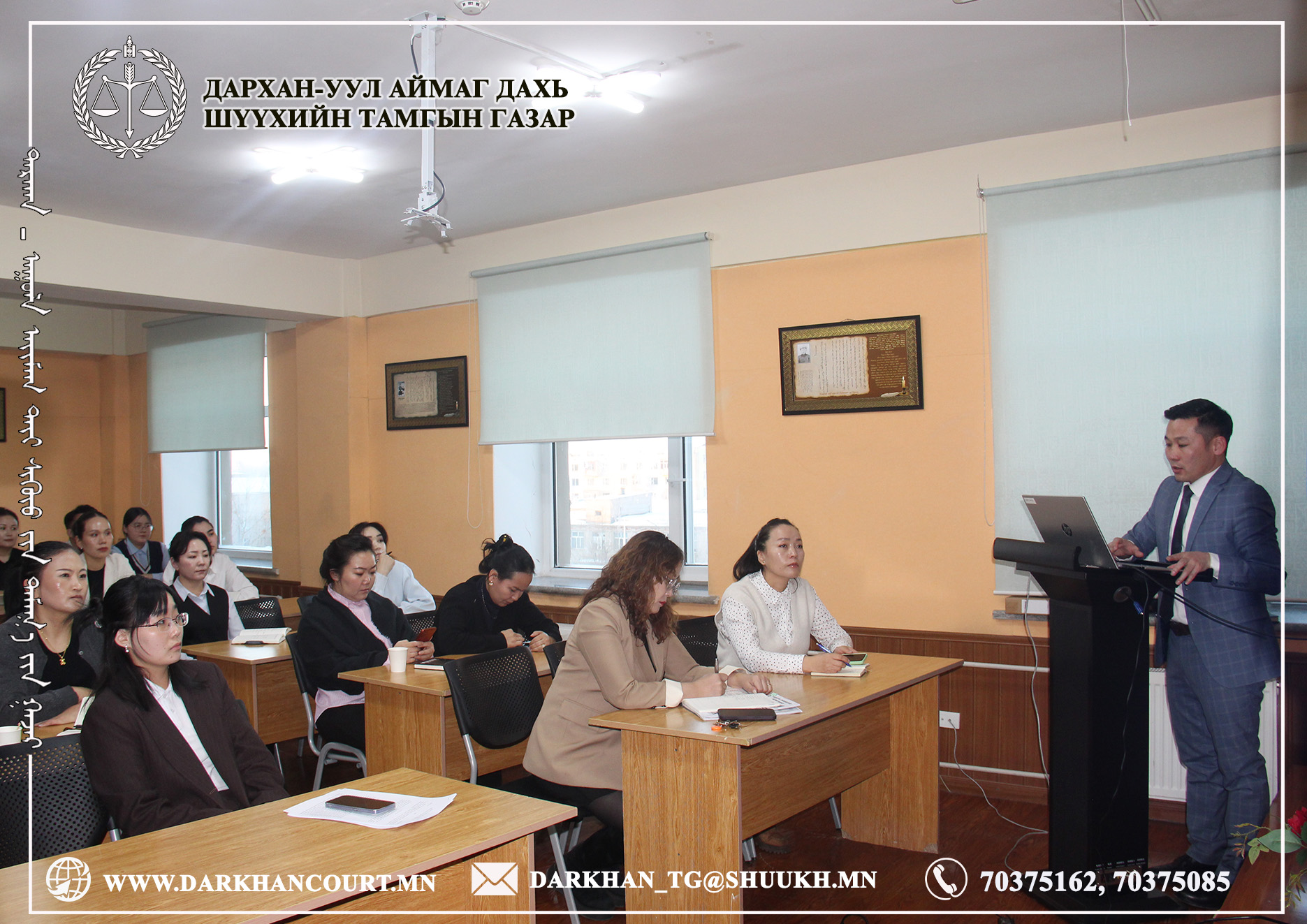 Программ хангамж хариуцсан референт М.Зоригтзаяа шүүхийн захиргааны ажилтнуудад Шүүхийн захиргааны үйл ажиллагааны ERP системийн Хүний нөөцийн удирдлага, Архив, Албан хэрэг хөтлөлтийн модуль болон shuukh.mn, Албаны цахим шуудан ашиглалтын талаар сургалт зохион байгуулж, шүүгчийн туслах, шүүх хуралдааны нарийн бичгийн дарга нарын сонирхсон асуултад хариулж, ярилцлага өрнүүлэн мэдээлэл солилцов.