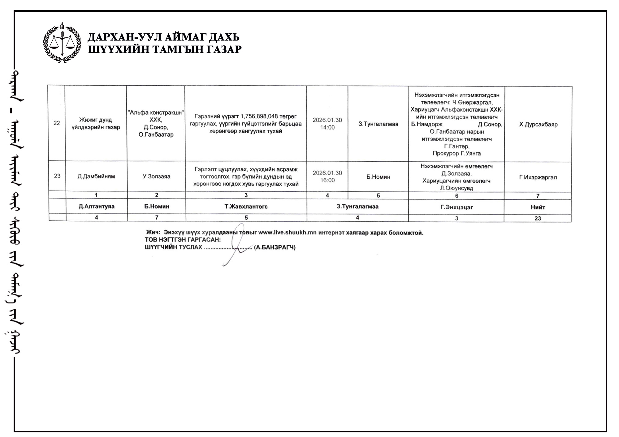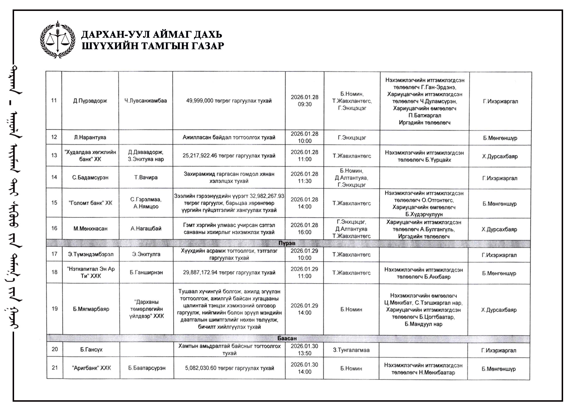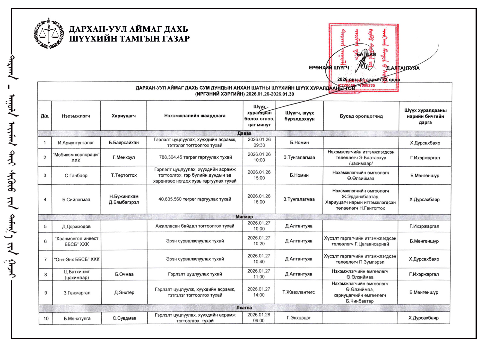 ШҮҮХ ХУРАЛДААНЫ ТОВ /ДАРХАН-УУЛ АЙМАГ ДАХЬ ЗАХИРГААНЫ ХЭРГИЙН АНХАН ШАТНЫ ШҮҮХ 2026.01.26-01.30/
