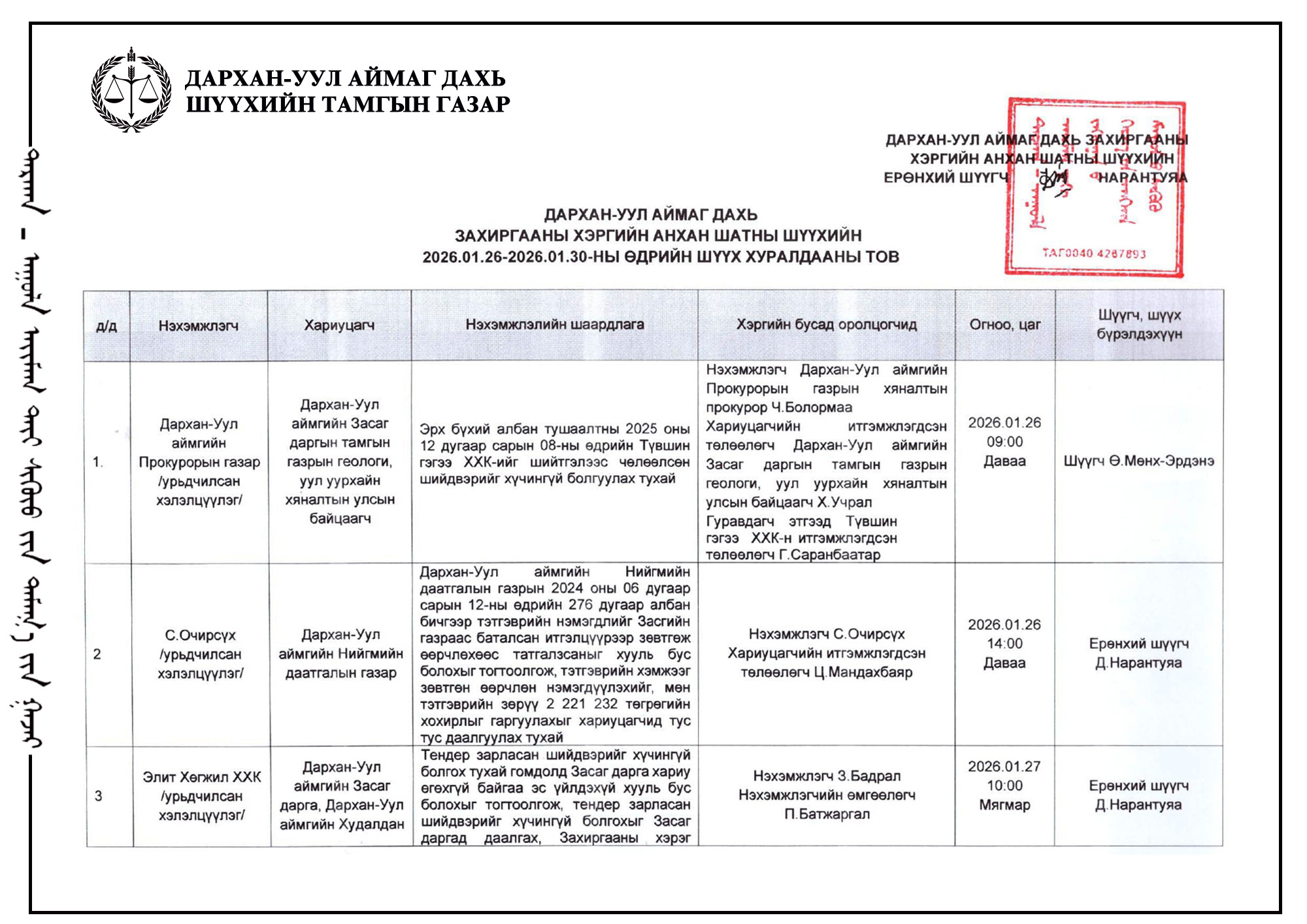 ШҮҮХ ХУРАЛДААНЫ ТОВ /ДАРХАН-УУЛ АЙМАГ ДАХЬ ЗАХИРГААНЫ ХЭРГИЙН АНХАН ШАТНЫ ШҮҮХ 2026.01.26-01.30/