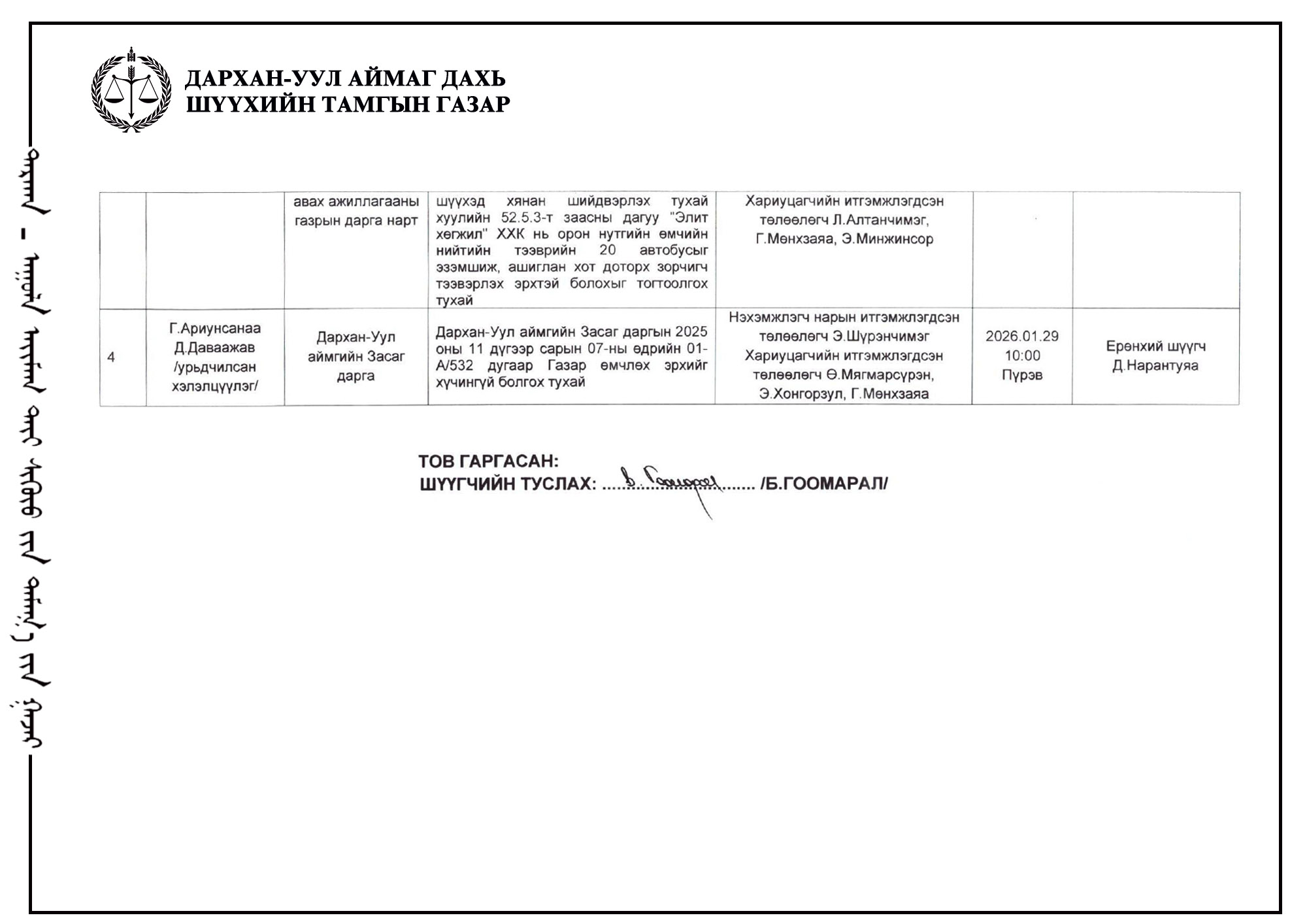 ШҮҮХ ХУРАЛДААНЫ ТОВ /ДАРХАН-УУЛ АЙМАГ ДАХЬ ЗАХИРГААНЫ ХЭРГИЙН АНХАН ШАТНЫ ШҮҮХ 2026.01.19-01.23/