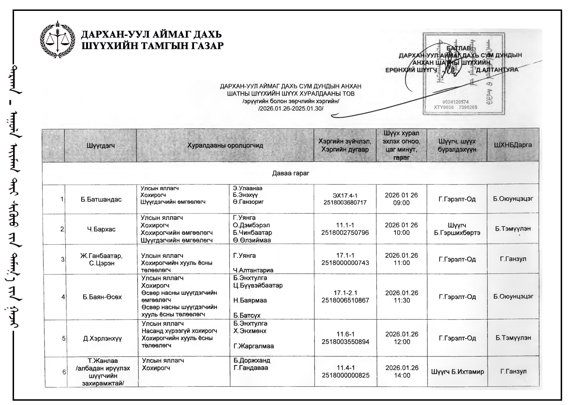 ШҮҮХ ХУРАЛДААНЫ ТОВ /ДАРХАН-УУЛ АЙМАГ ДАХЬ ЗАХИРГААНЫ ХЭРГИЙН АНХАН ШАТНЫ ШҮҮХ 2026.01.26-01.30/