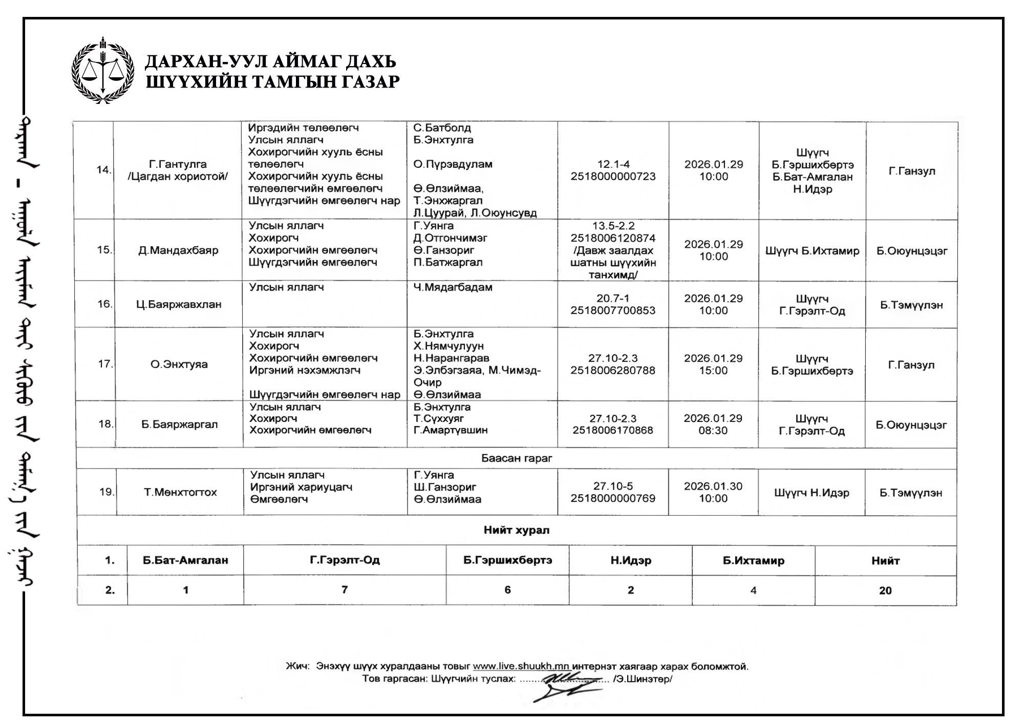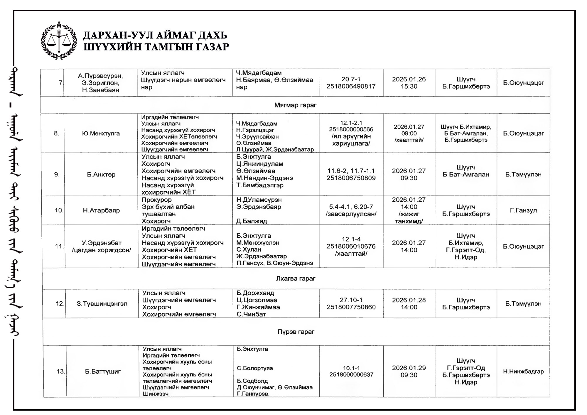 ШҮҮХ ХУРАЛДААНЫ ТОВ /ДАРХАН-УУЛ АЙМАГ ДАХЬ ЗАХИРГААНЫ ХЭРГИЙН АНХАН ШАТНЫ ШҮҮХ 2026.01.19-01.23/