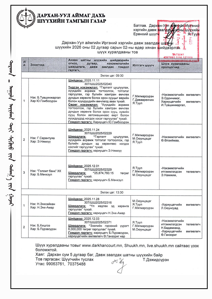 ШҮҮХ ХУРАЛДААНЫ ТОВ /ДАРХАН-УУЛ АЙМАГ ДАХЬ ЗАХИРГААНЫ ХЭРГИЙН АНХАН ШАТНЫ ШҮҮХ 2026.01.26-01.30/