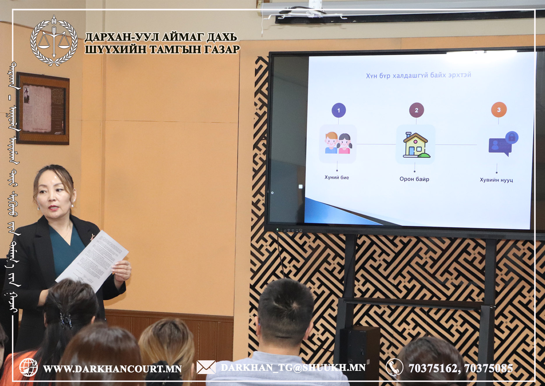 2026-01-30 | 7Төрийн болон албаны нууцыг хадгалах, хамгаалах болон Хүний хувийн мэдээлэл хамгаалах тухай хууль, холбогдох журмын хэрэгжилтийн талаар нууц хамгаалах ажилтан шүүхийн захиргааны ажилтнуудад сургалт хийлээ.