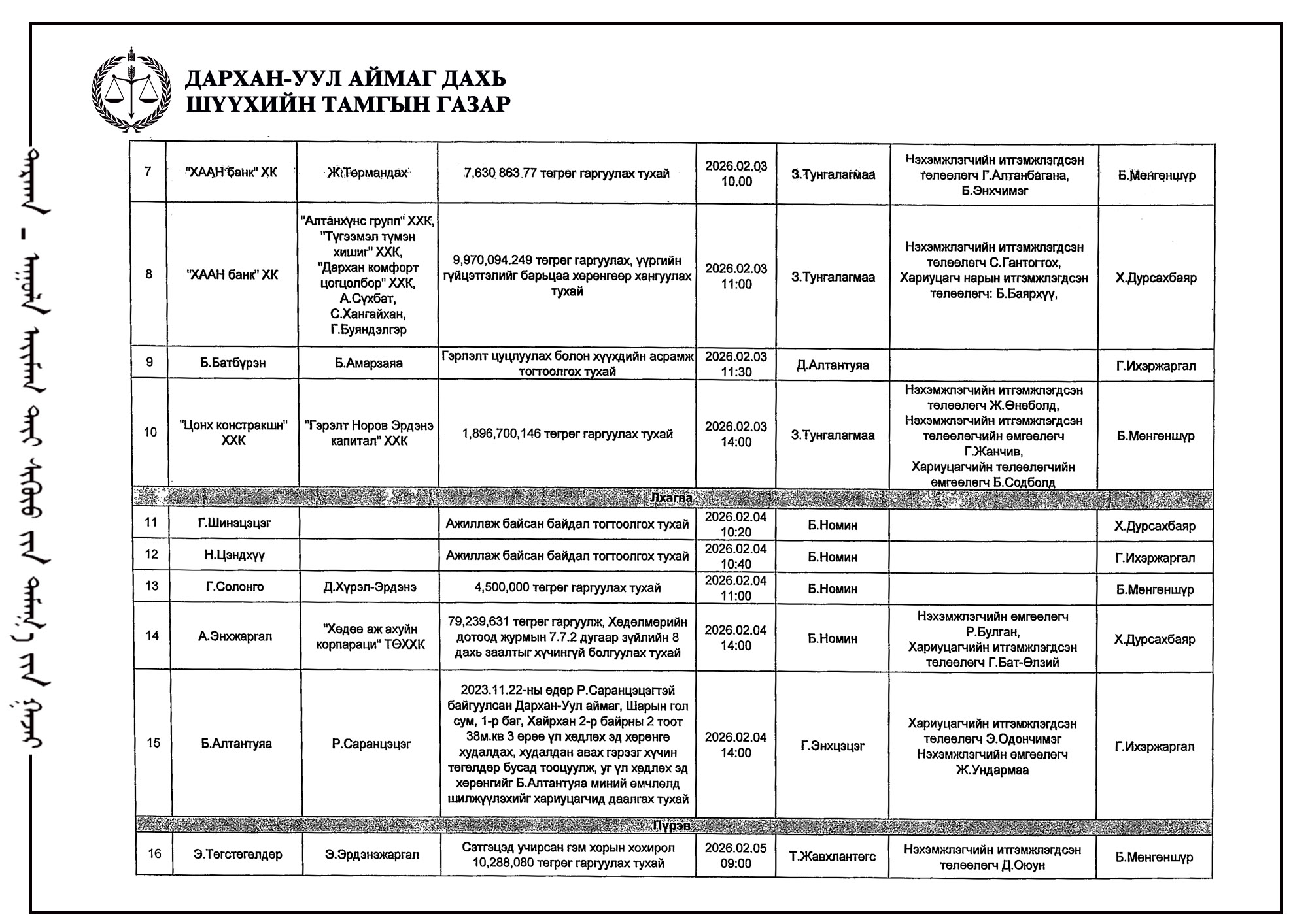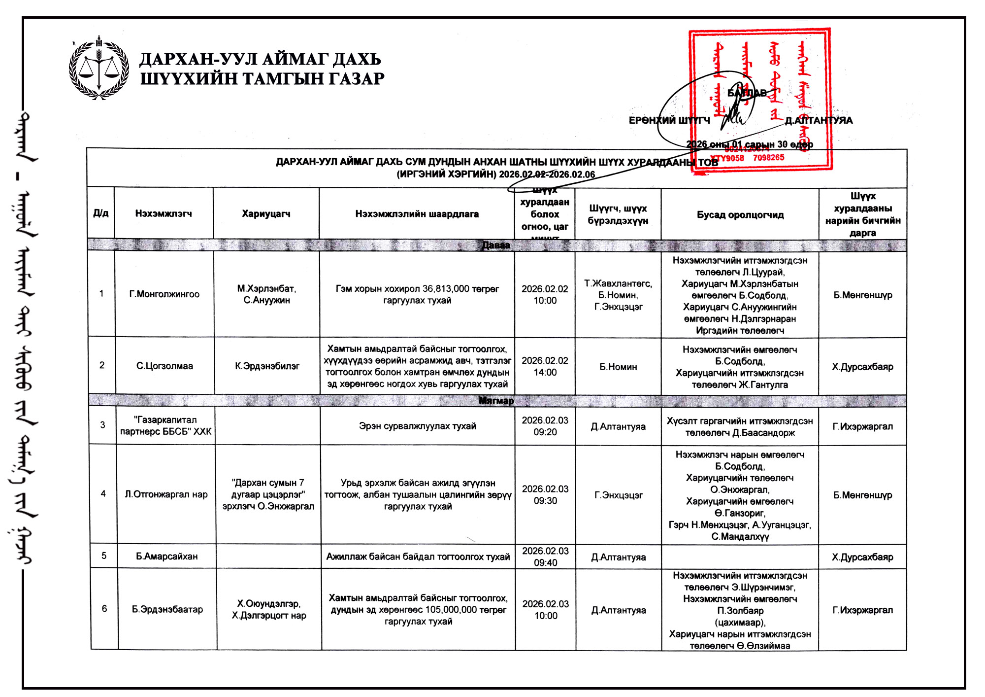 ШҮҮХ ХУРАЛДААНЫ ТОВ /ДАРХАН-УУЛ АЙМАГ ДАХЬ ЗАХИРГААНЫ ХЭРГИЙН АНХАН ШАТНЫ ШҮҮХ 2026.02.02-2026.02.06/