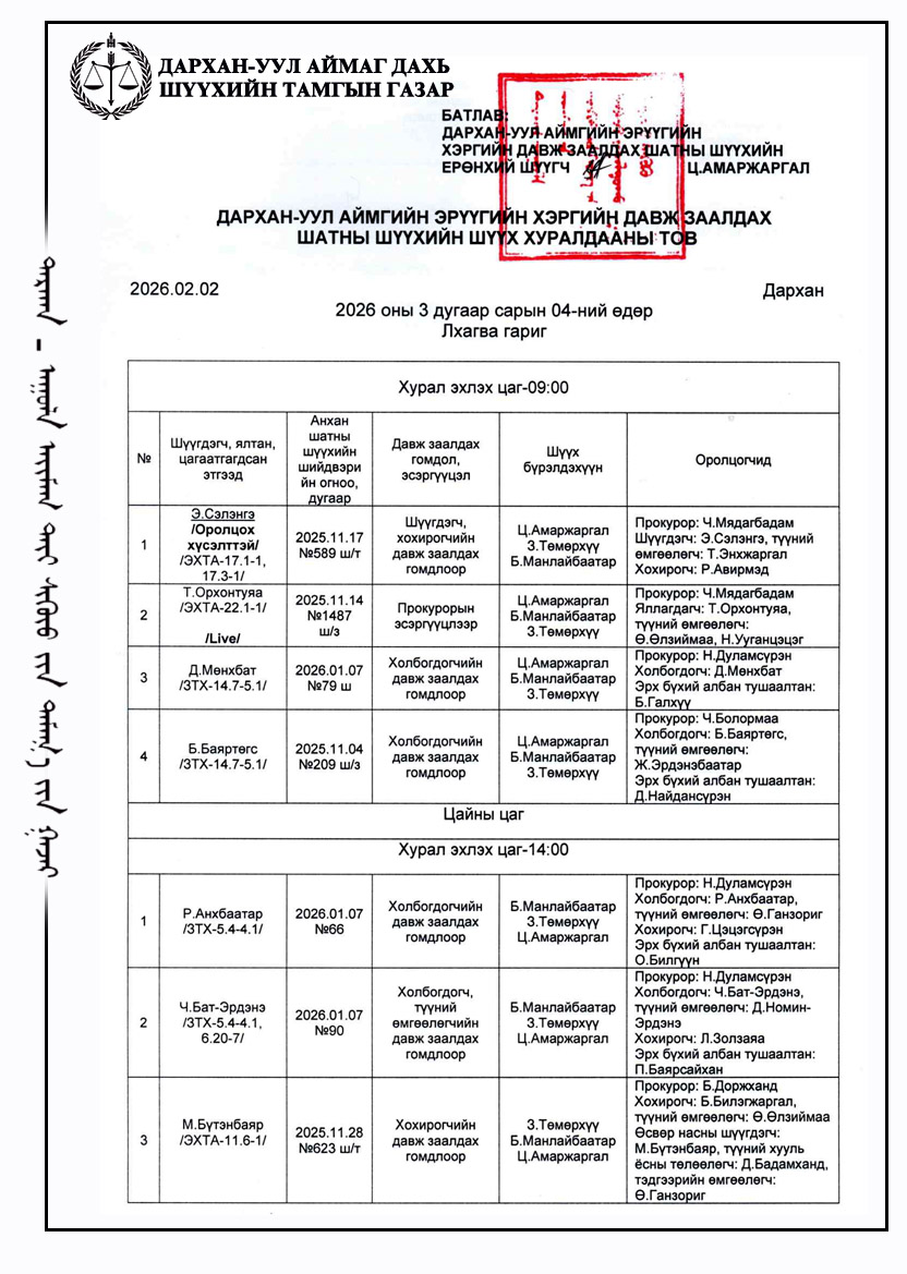 ШҮҮХ ХУРАЛДААНЫ ТОВ /ДАРХАН-УУЛ АЙМАГ ДАХЬ ЗАХИРГААНЫ ХЭРГИЙН АНХАН ШАТНЫ ШҮҮХ 2026.02.02-2026.02.06/