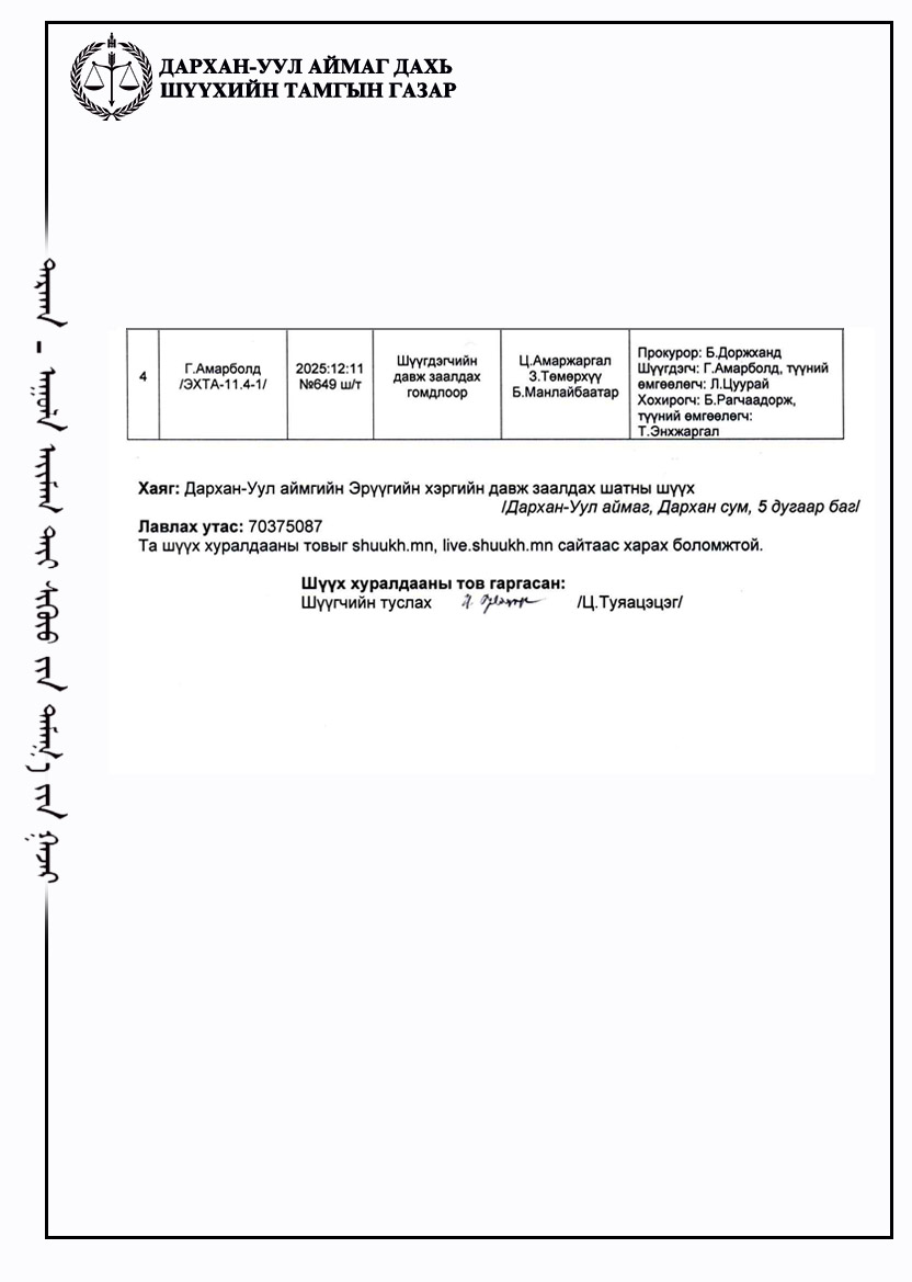 ШҮҮХ ХУРАЛДААНЫ ТОВ /ДАРХАН-УУЛ АЙМГИЙН ЭРҮҮГИЙН ХЭРГИЙН ДАВЖ ЗААЛДАХ ШАТНЫ ШҮҮХ 2026.03.04/