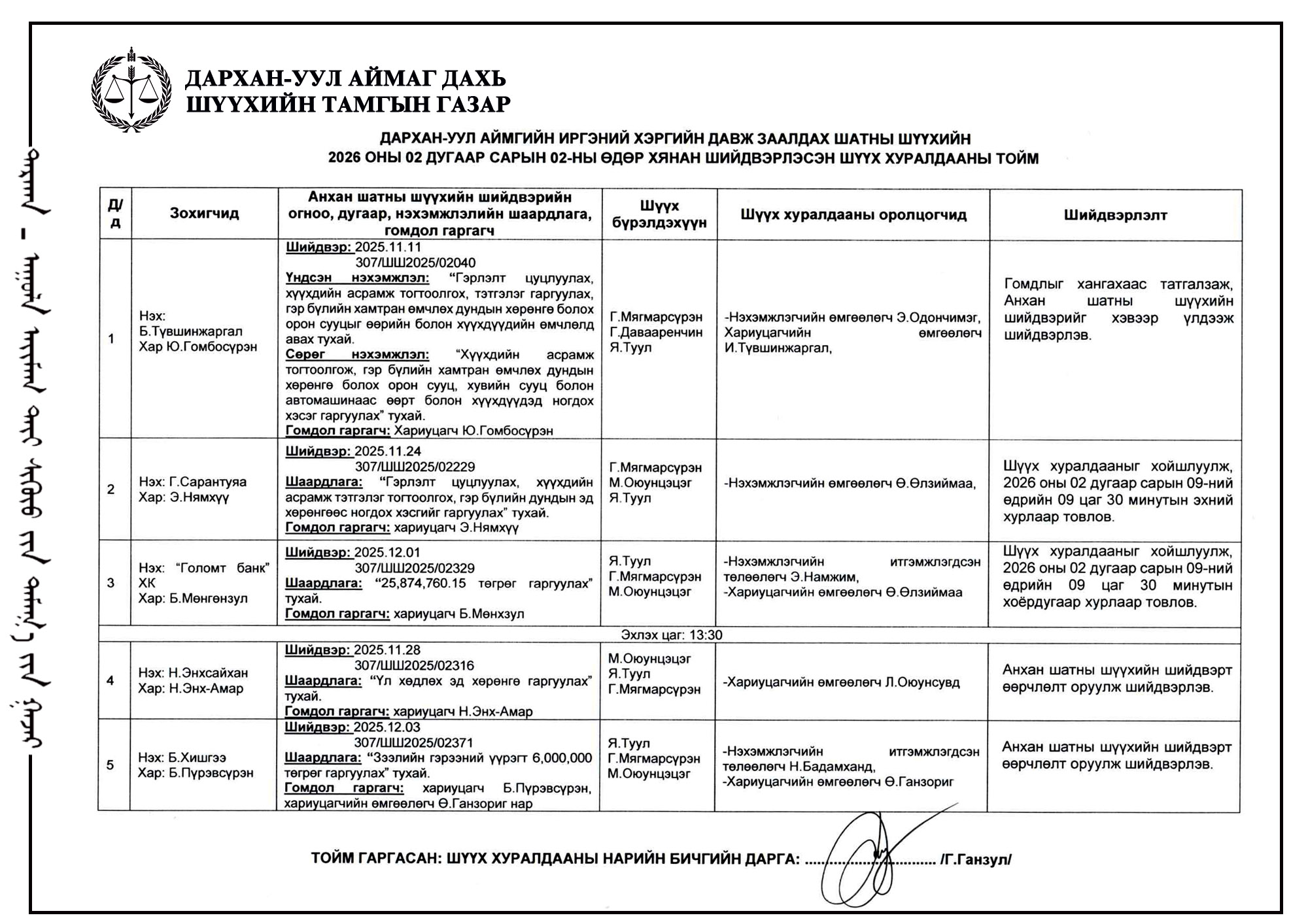 ШҮҮХ ХУРАЛДААНЫ ТОВ /ДАРХАН-УУЛ АЙМАГ ДАХЬ ЗАХИРГААНЫ ХЭРГИЙН АНХАН ШАТНЫ ШҮҮХ 2026.02.02-2026.02.06/