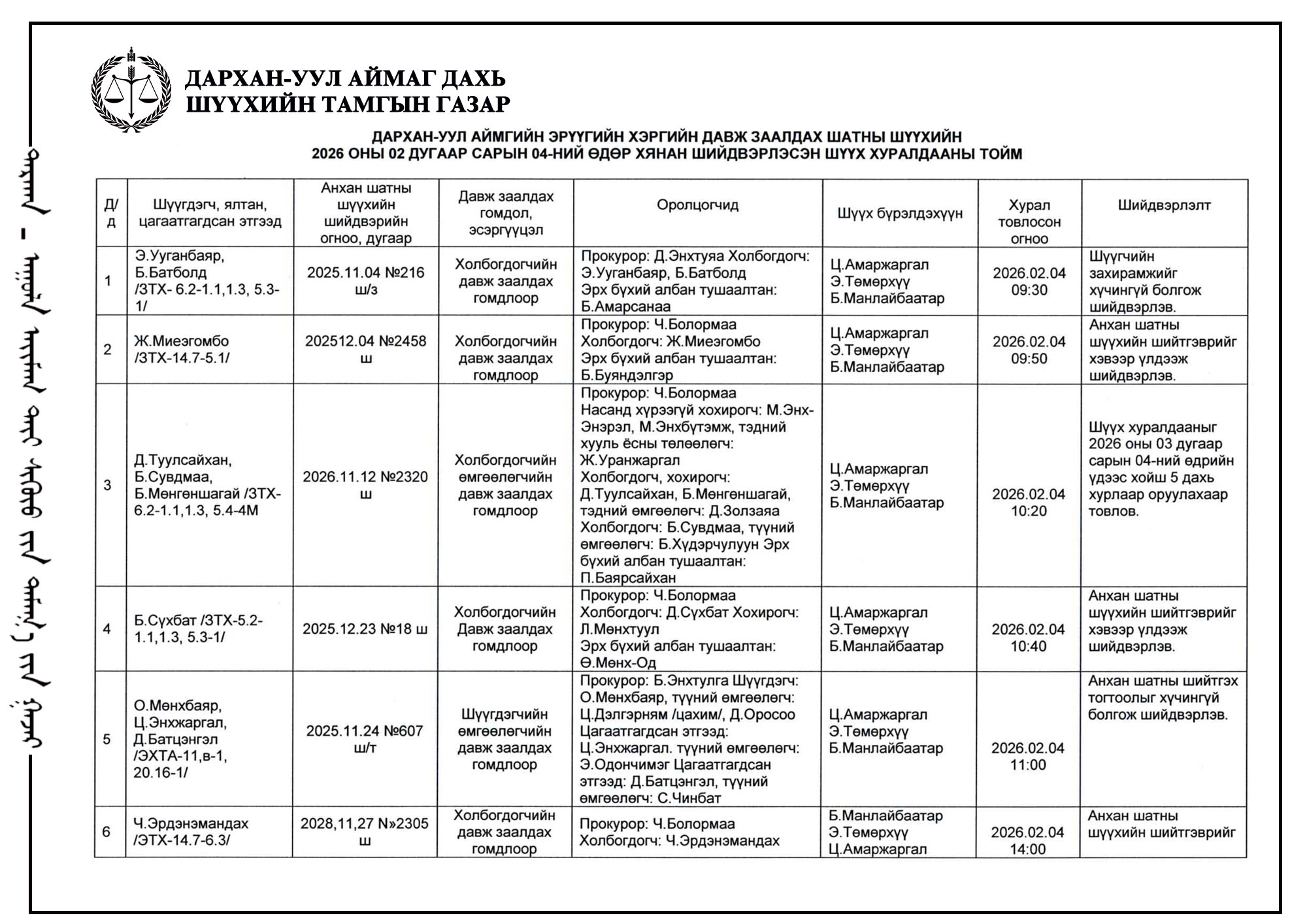 ЭРҮҮГИЙН БОЛОН ЗӨРЧЛИЙН ХЭРГИЙН ШҮҮХ ХУРАЛДААНЫ ТОВ /ДАРХАН-УУЛ АЙМАГ ДАХЬ СУМ ДУНДЫН АНХАН ШАТНЫ ШҮҮХ 2026.02.02-2026.02.06/