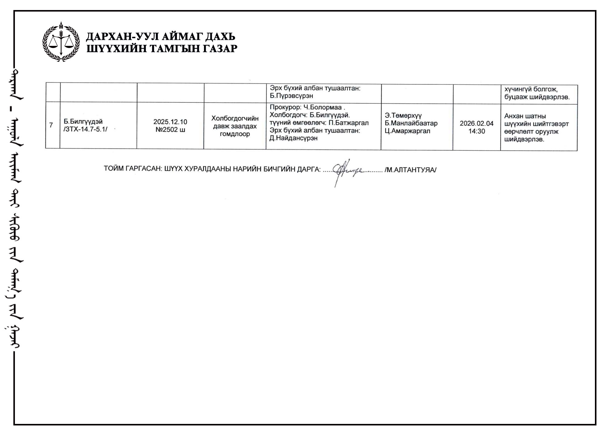 ШҮҮХ ХУРАЛДААНЫ ТОВ /ДАРХАН-УУЛ АЙМГИЙН ЭРҮҮГИЙН ХЭРГИЙН ДАВЖ ЗААЛДАХ ШАТНЫ ШҮҮХ 2026.03.04/