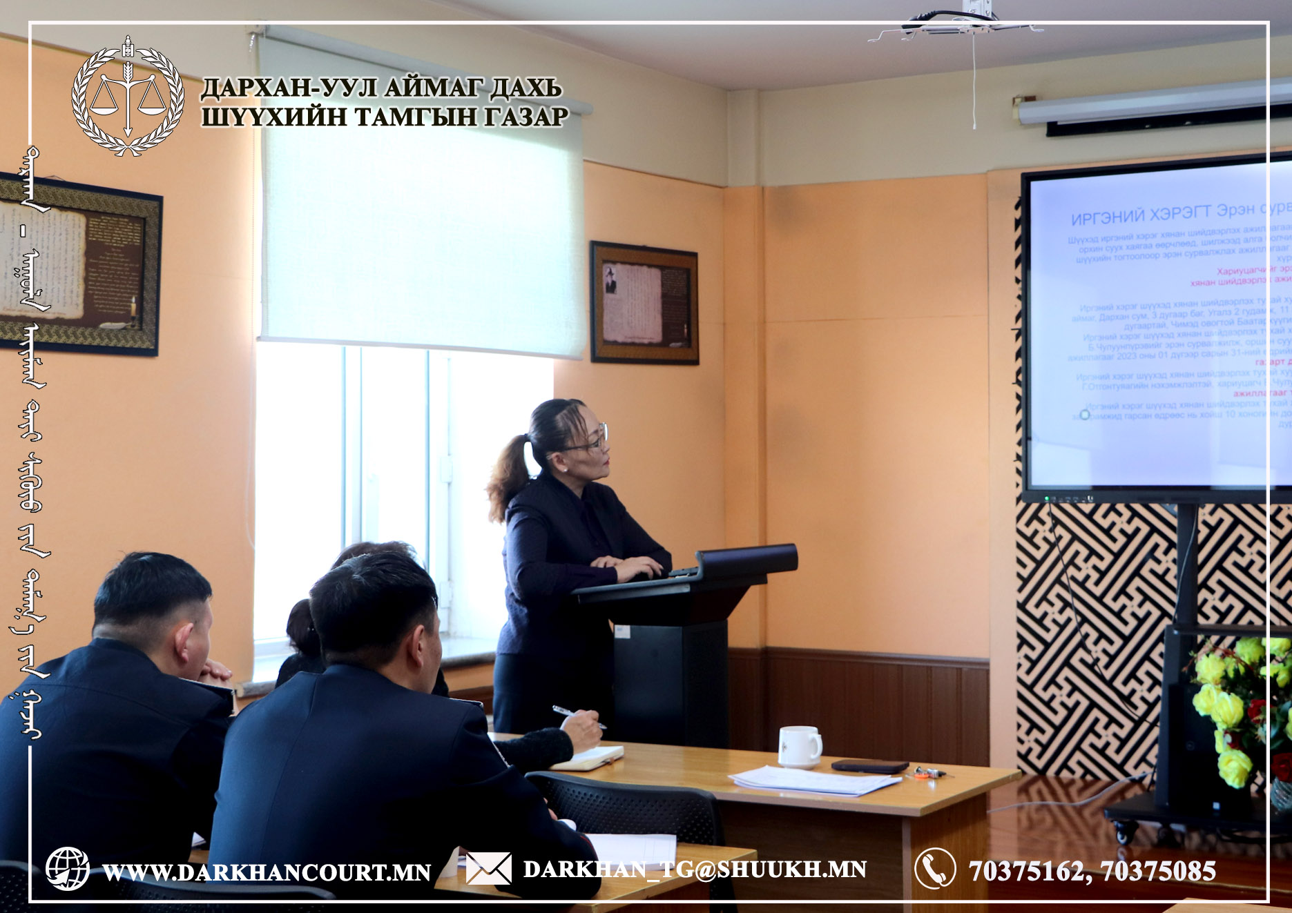 Дархан-Уул аймгийн Цагдаагийн газартай хамтран 2025 онд хэрэгжүүлсэн ажлын үр дүн, 2026 онд хамтран ажиллах ажлын төлөвлөгөөний дагуу гүйцэтгэх ажлын талаар мэдээлэл солилцох уулзалт хийж эрэн сурвалжлах, албадан ирүүлэх ажиллагааны явцын мэдээлэл, шүүхийн байранд үүрэг гүйцэтгэж буй цагдаагийн алба хаагчдын өдөр тутмын үйл ажиллагаандаа анхаарах асуудлын талаар мэдээлэл солилцлоо.