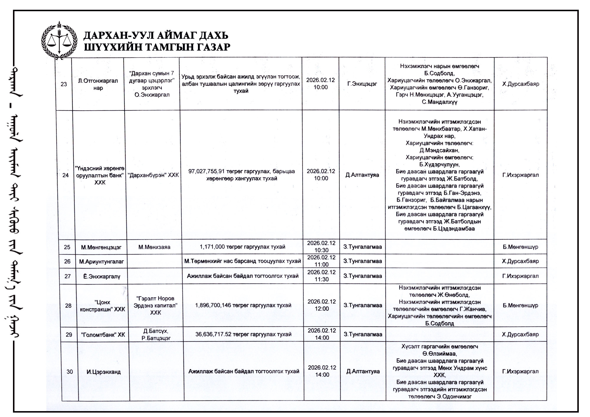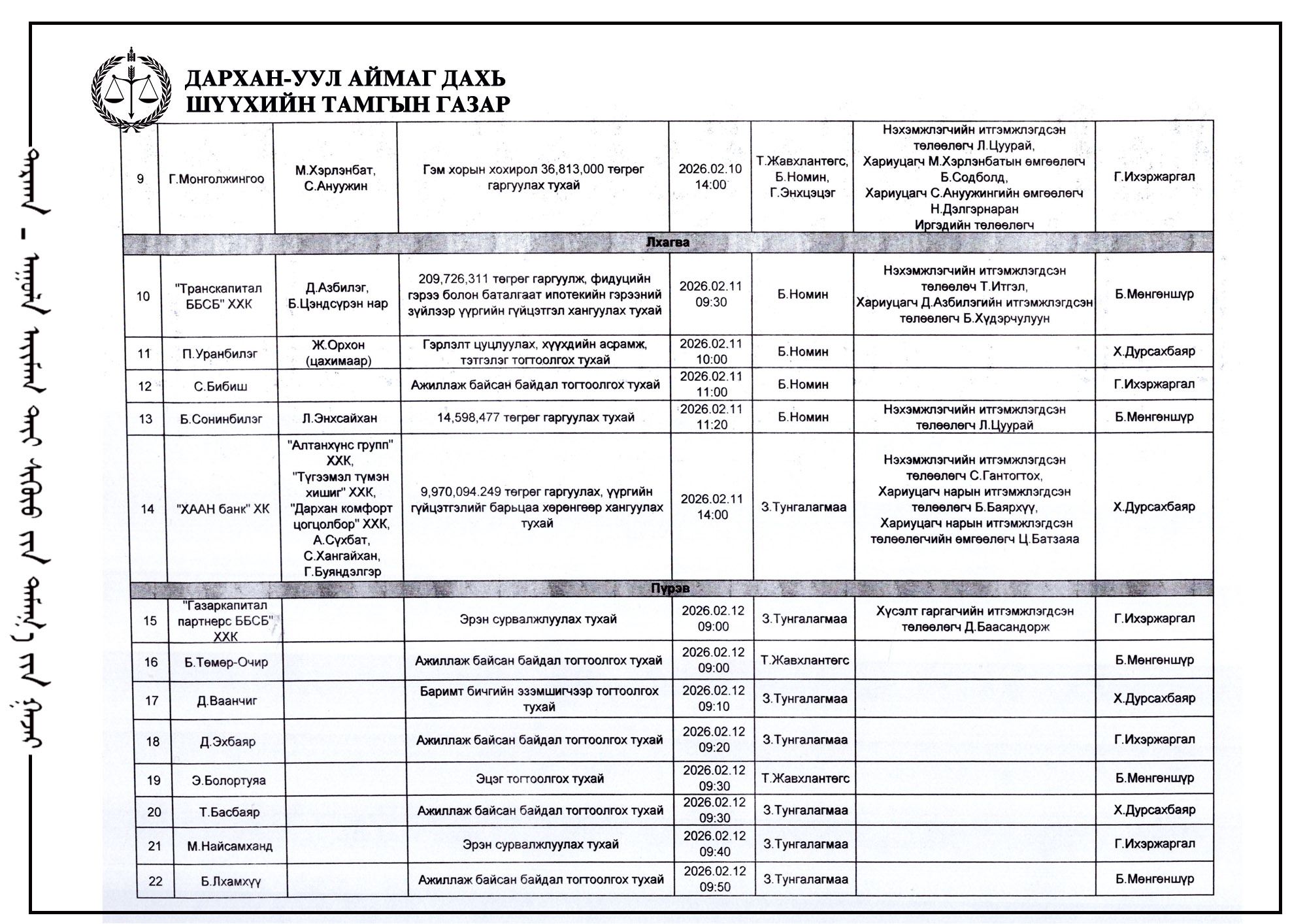 ШҮҮХ ХУРАЛДААНЫ ТОВ /ДАРХАН-УУЛ АЙМГИЙН ИРГЭНИЙ ХЭРГИЙН АНХАН ШАТНЫ ШҮҮХ 2026.02.09-2026.02.13/