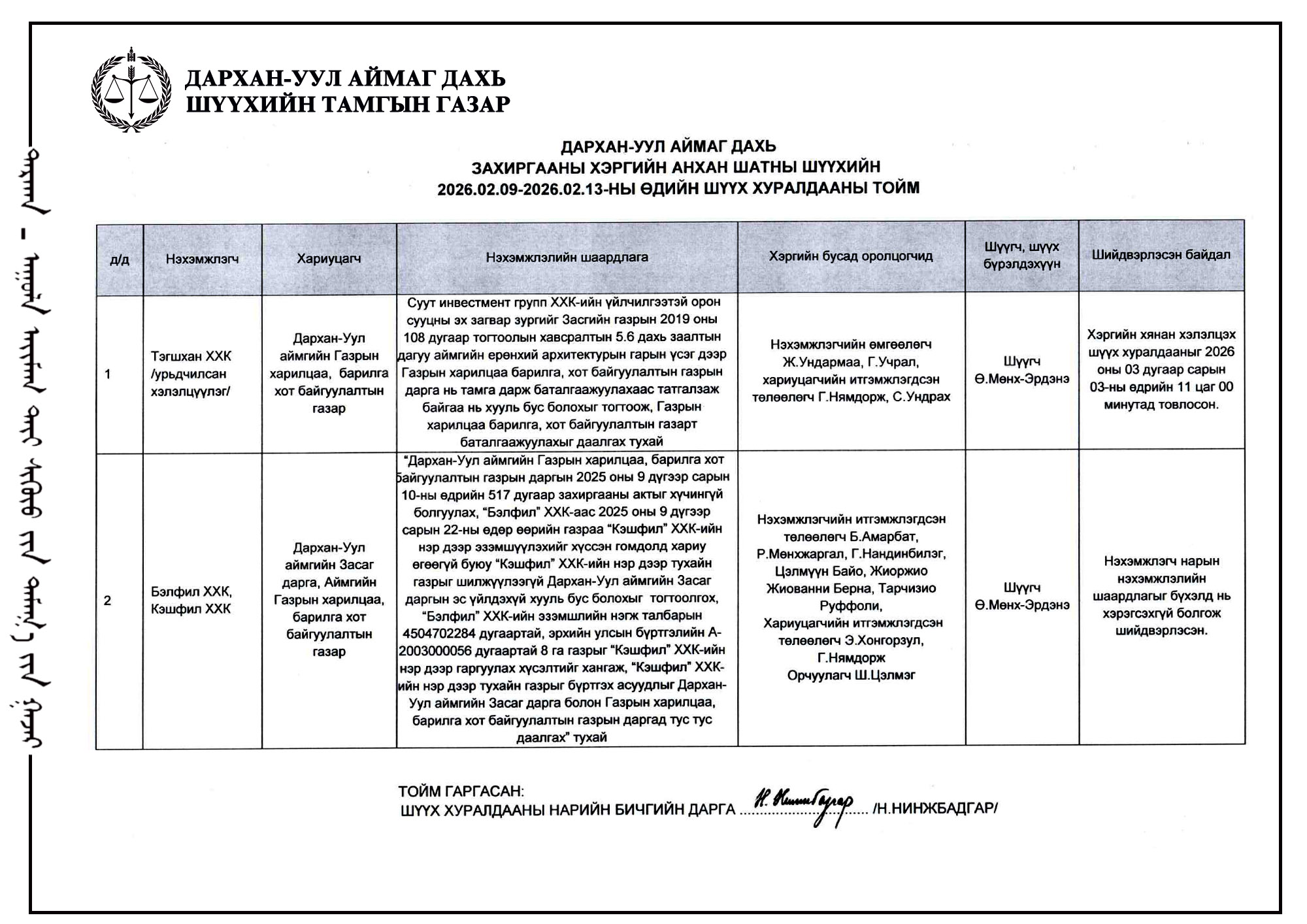 ШҮҮХ ХУРАЛДААНЫ ТОВ /ДАРХАН-УУЛ АЙМГИЙН ИРГЭНИЙ ХЭРГИЙН ДАВЖ ЗААЛДАХ ШАТНЫ ШҮҮХ 2026.02.11/
