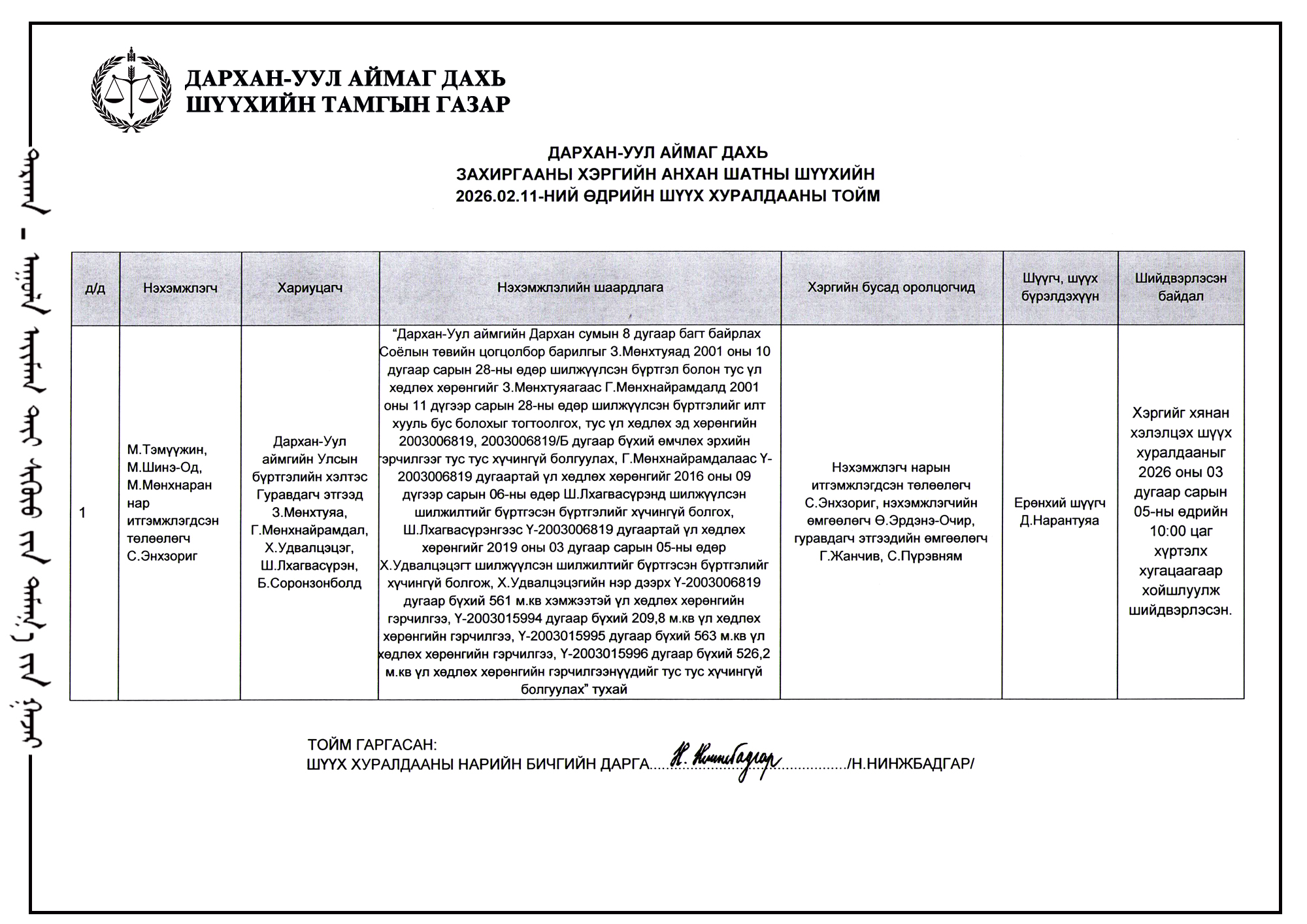 ШҮҮХ ХУРАЛДААНЫ ТОВ /ДАРХАН-УУЛ АЙМГИЙН ИРГЭНИЙ ХЭРГИЙН ДАВЖ ЗААЛДАХ ШАТНЫ ШҮҮХ 2026.02.11/