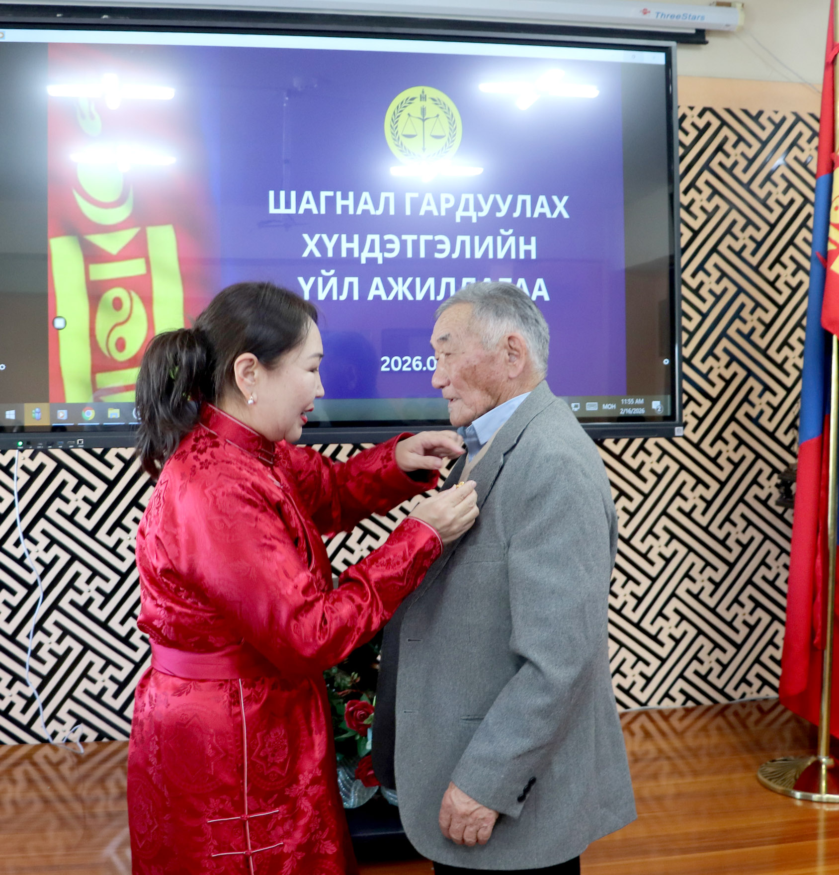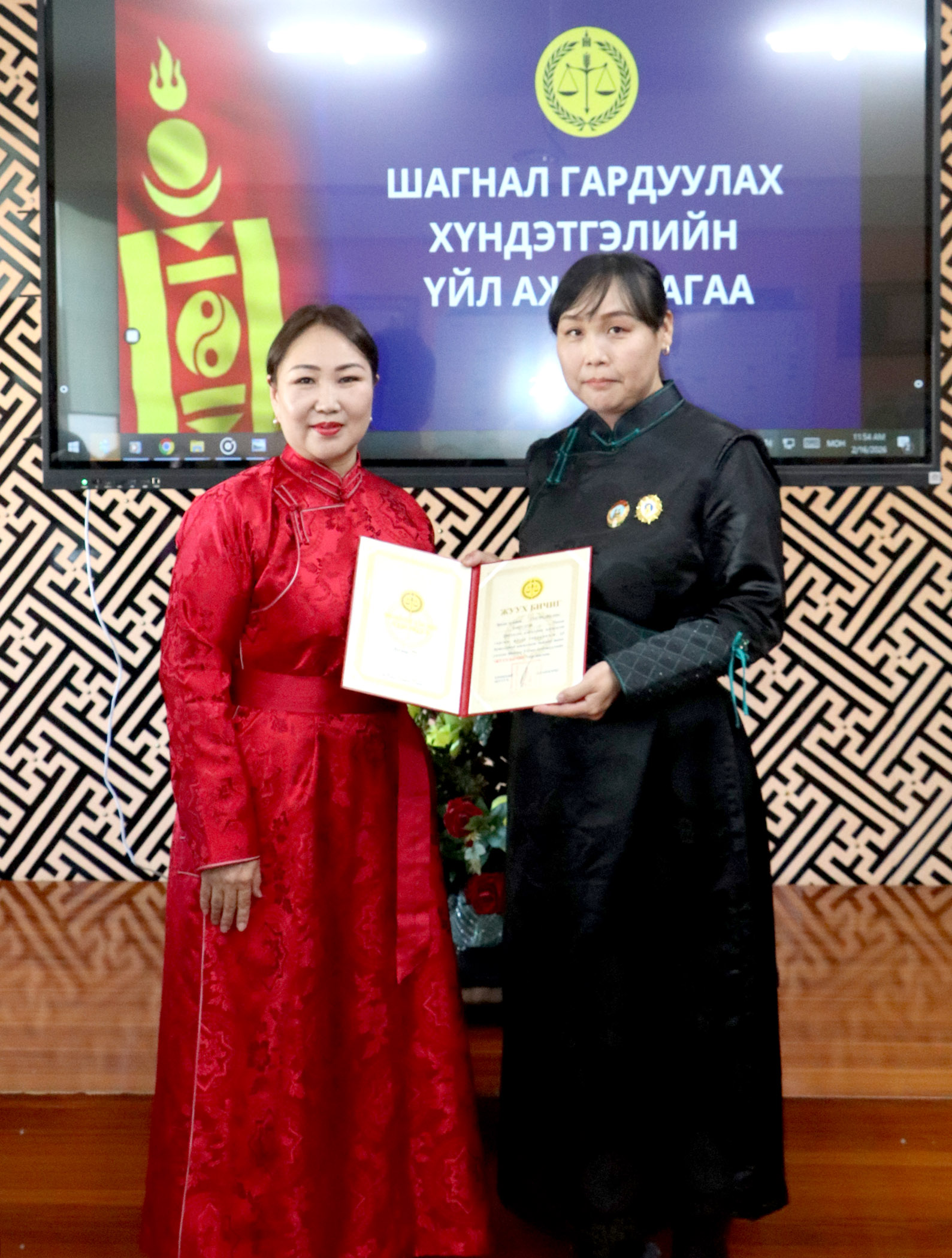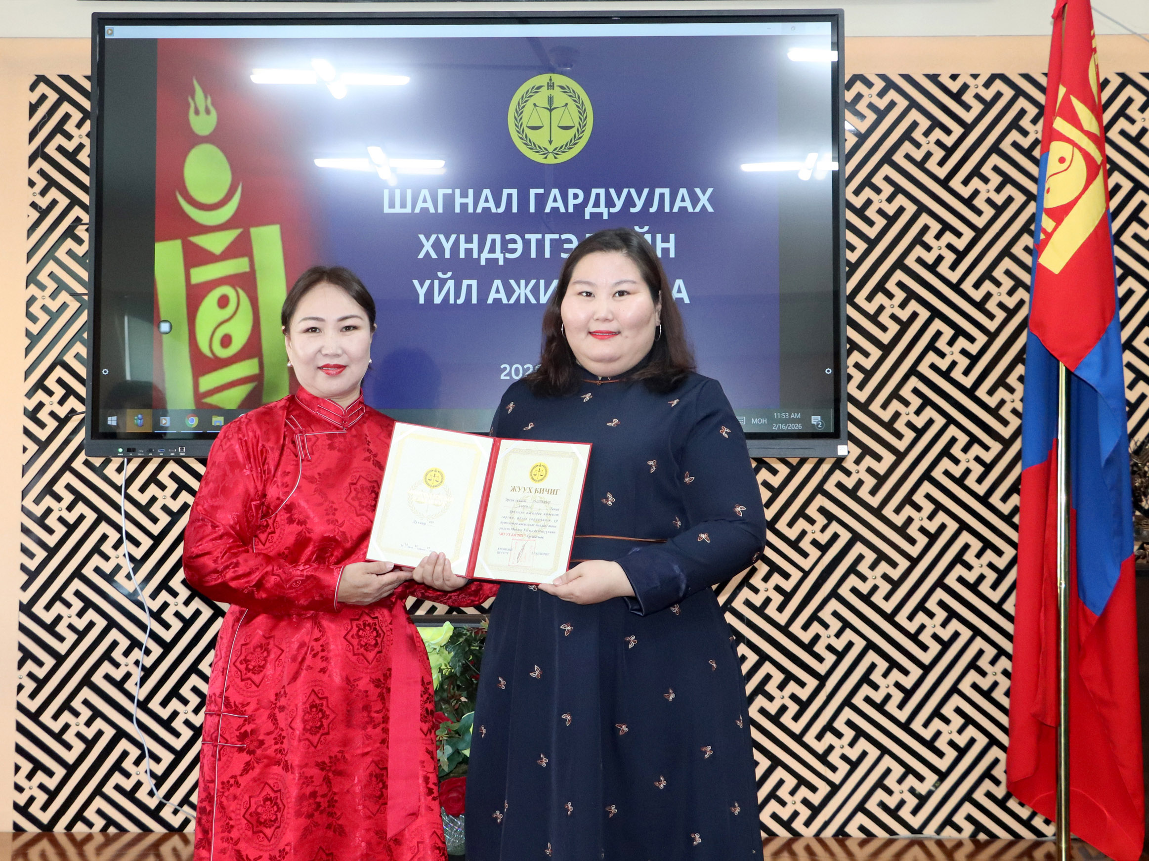 2026-02-17 | 15Арван долоо дугаар жарны “Сүрээр дарагч” хэмээх гал Морин жилийн Билгийн тооллын хаврын тэргүүн сарын шинийн нэгэн буюу Монголын уламжлалт сар шинийн баярыг тохиолдуулан Дархан-Уул аймаг дахь шүүхийн Тамгын газрын дарга Загдаагийн Баяржаргал нь Монгол Улсын Ерөнхийлөгчийн 2026 оны 02 дугаар сарын 06-ны өдрийн 12 дугаар зарлигаар АЛТАН ГАДАС одонгоор энгэрээ мялаалаа.