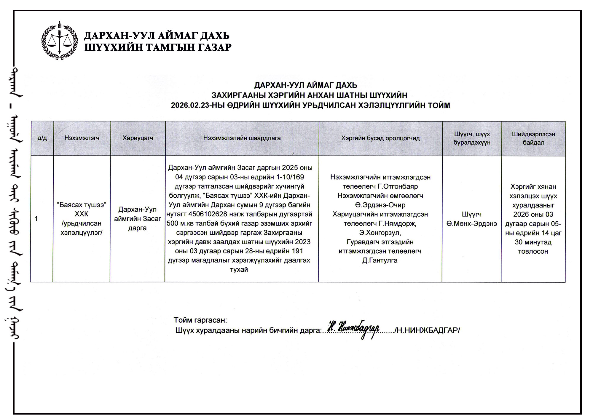 ШҮҮХ ХУРАЛДААНЫ ТОВ /ДАРХАН-УУЛ АЙМАГ ДАХЬ ЗАХИРГААНЫ ХЭРГИЙН АНХАН ШАТНЫ ШҮҮХ 2026.03.09-2026.03.13/