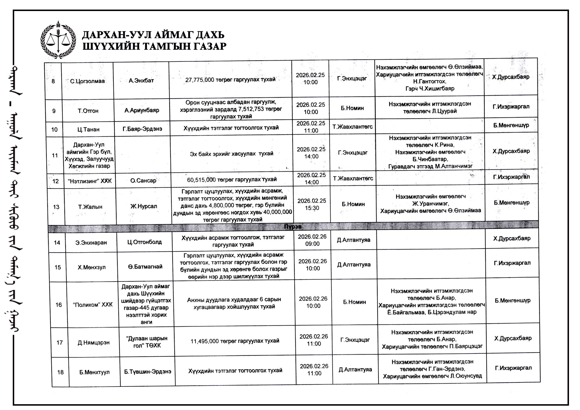ШҮҮХ ХУРАЛДААНЫ ТОВ /ДАРХАН-УУЛ АЙМАГ ДАХЬ ЗАХИРГААНЫ ХЭРГИЙН АНХАН ШАТНЫ ШҮҮХ 2026.02.23-2026.02.27/