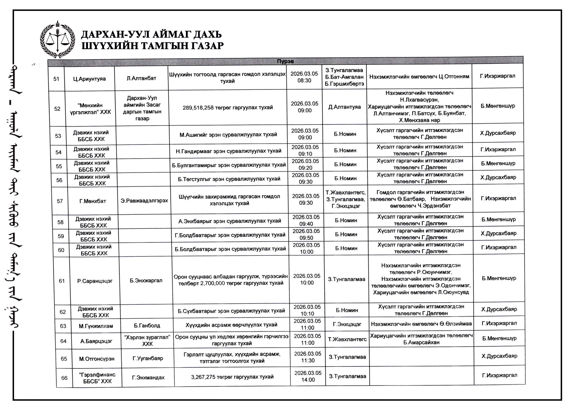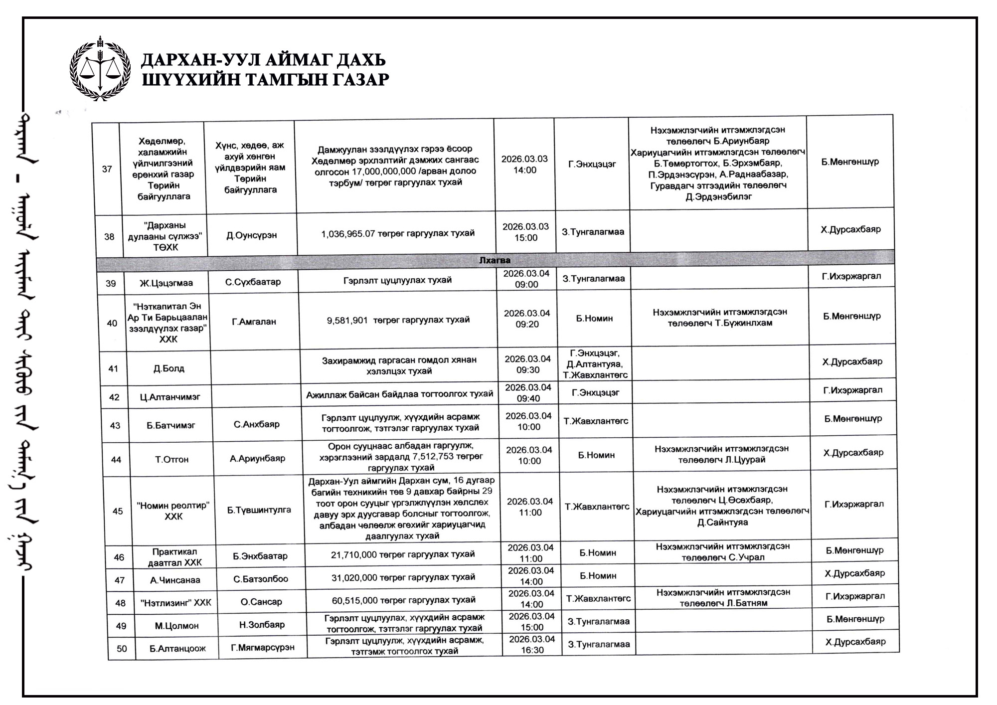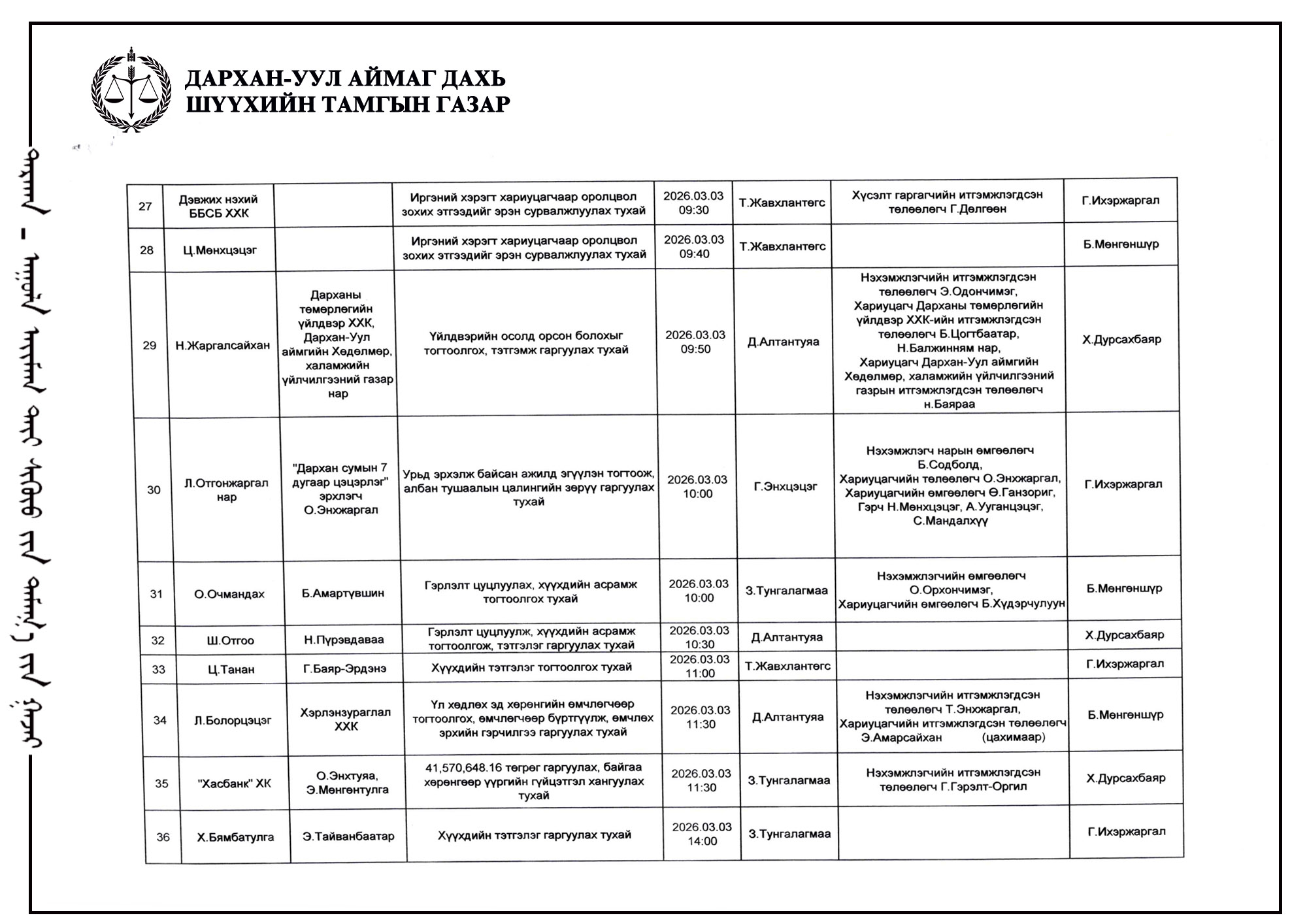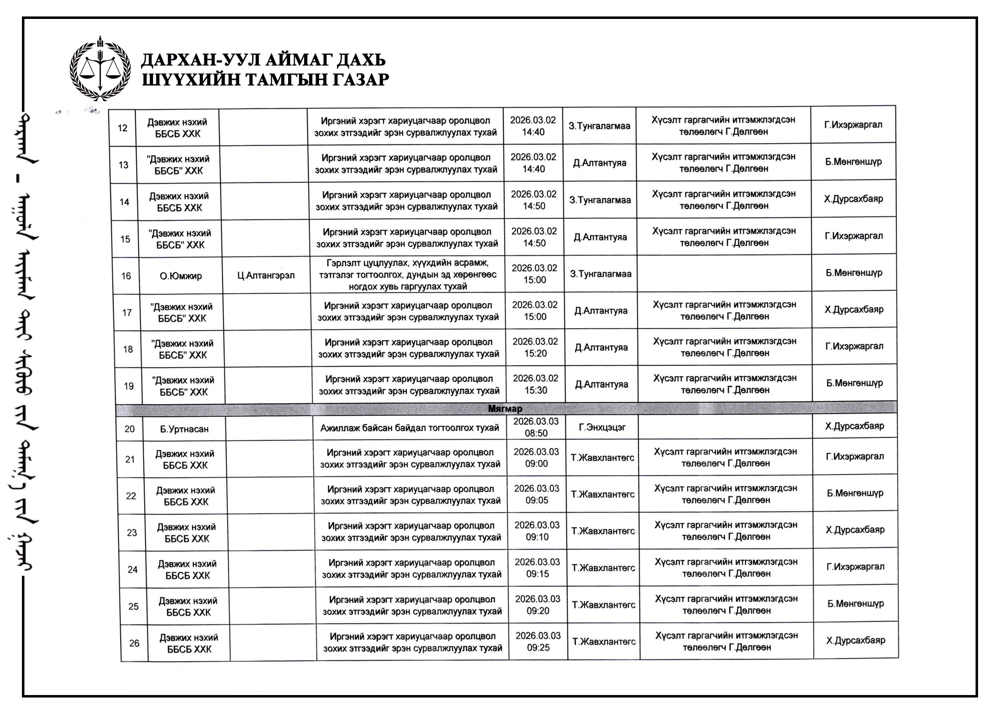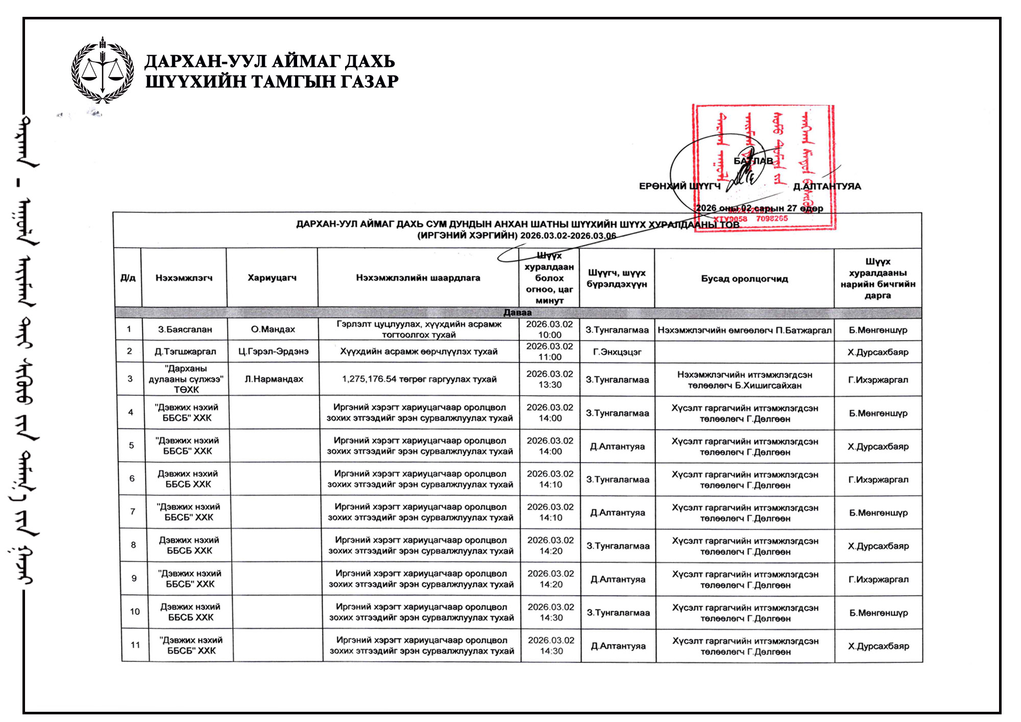ШҮҮХ ХУРАЛДААНЫ ТОВ /ДАРХАН-УУЛ АЙМГИЙН ИРГЭНИЙ ХЭРГИЙН АНХАН ШАТНЫ ШҮҮХ 2026.03.02-2026.03.06/
